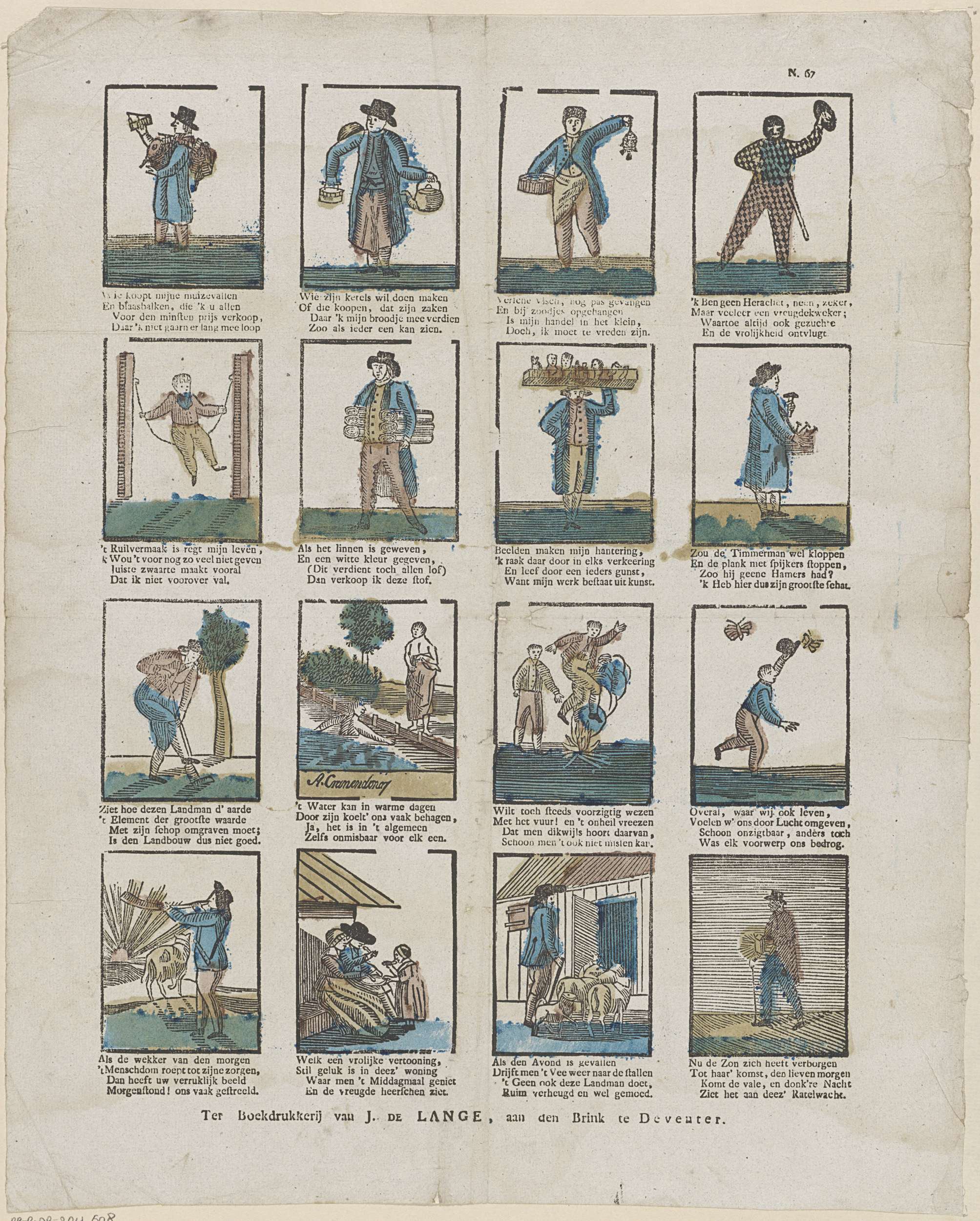 Blad met 16 voorstellingen van beroepen, zoals straatverkoper en boer, en bezigheden, zoals schommelen en zwemmen. Onder elke afbeelding een onderschrift. Genummerd rechtsboven: 67.