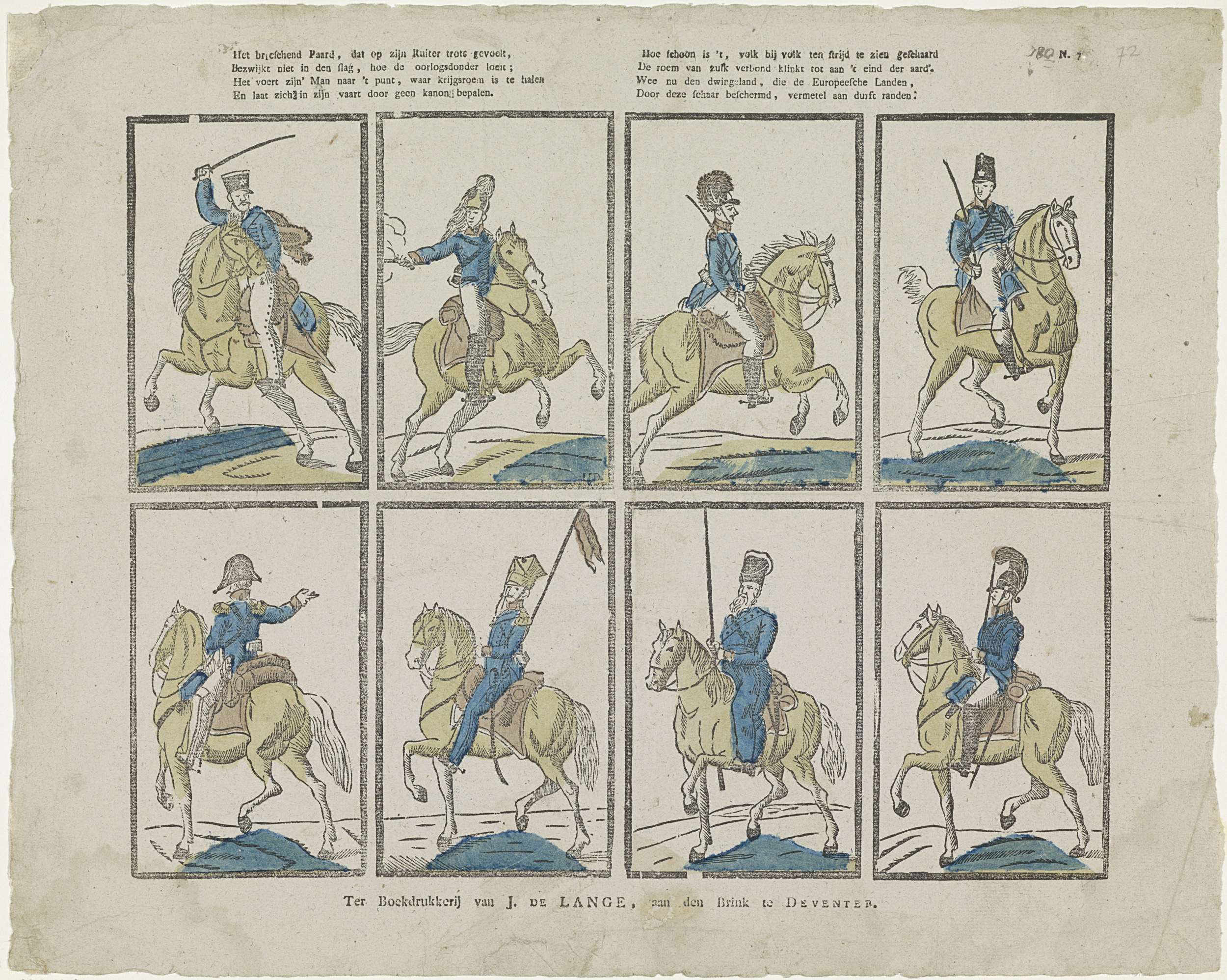 Blad met 8 voorstellingen van militairen te paard. Genummerd rechtsboven: N. 7[2].