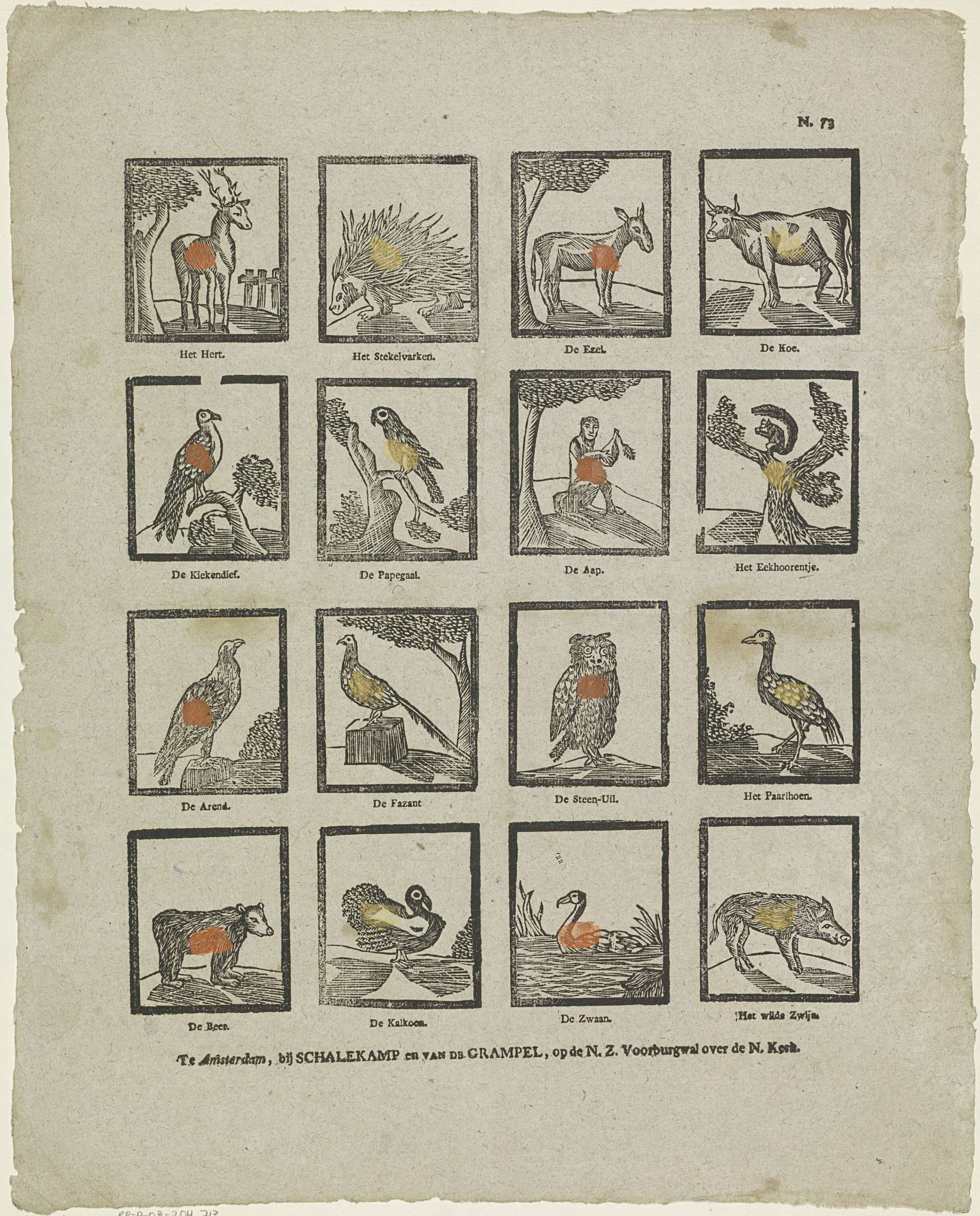 Blad met 16 voorstellingen van dieren, zoals een hert, een stekelvarken, een ezel en een koe. Onder elke afbeelding een onderschrift. Genummerd rechtsboven: N. 73.
