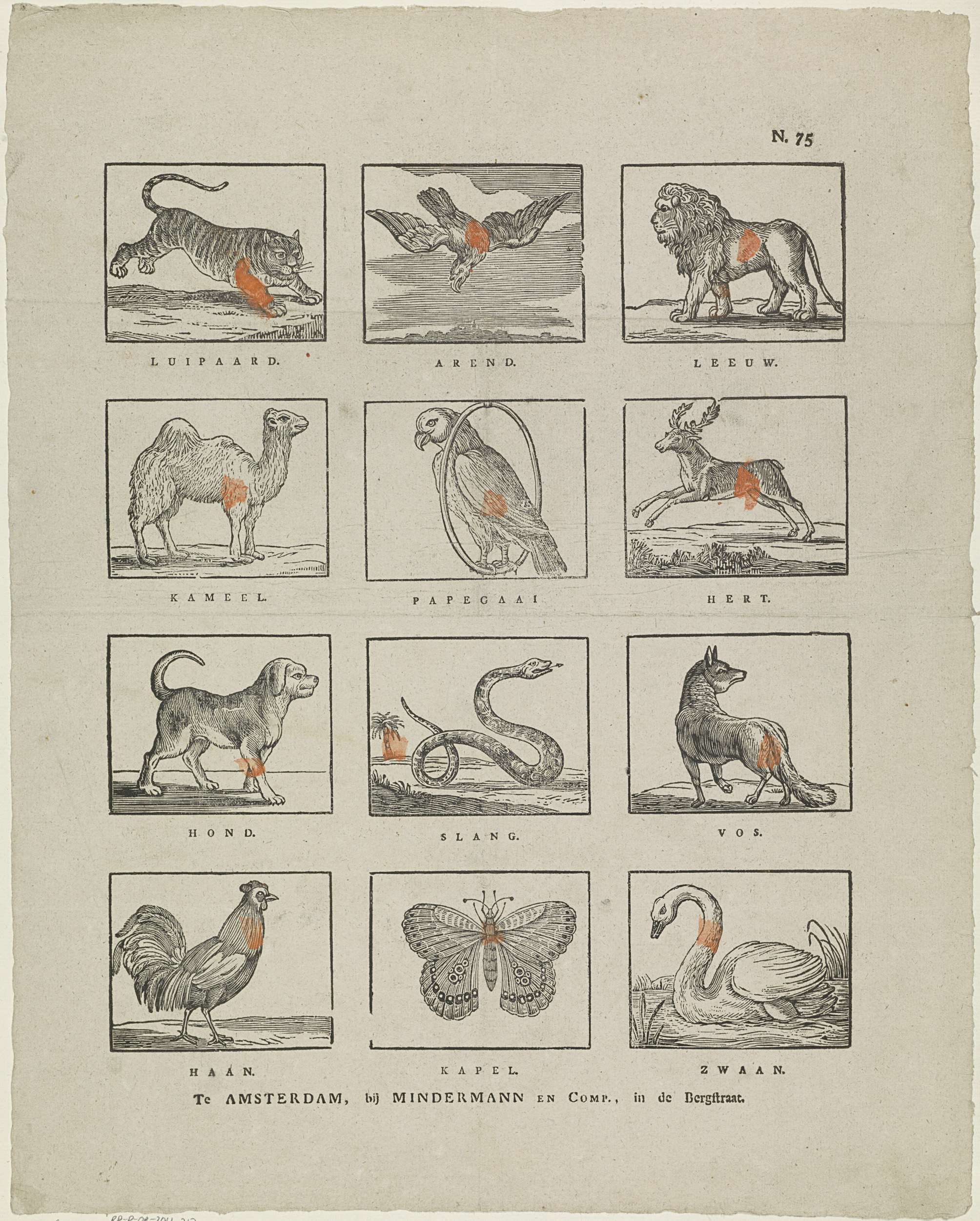 Blad met 12 voorstellingen van dieren, zoals een luipaard, een arend, een leeuw en een vlinder. Onder elke afbeelding een onderschrift. Genummerd rechtsboven: N. 75.