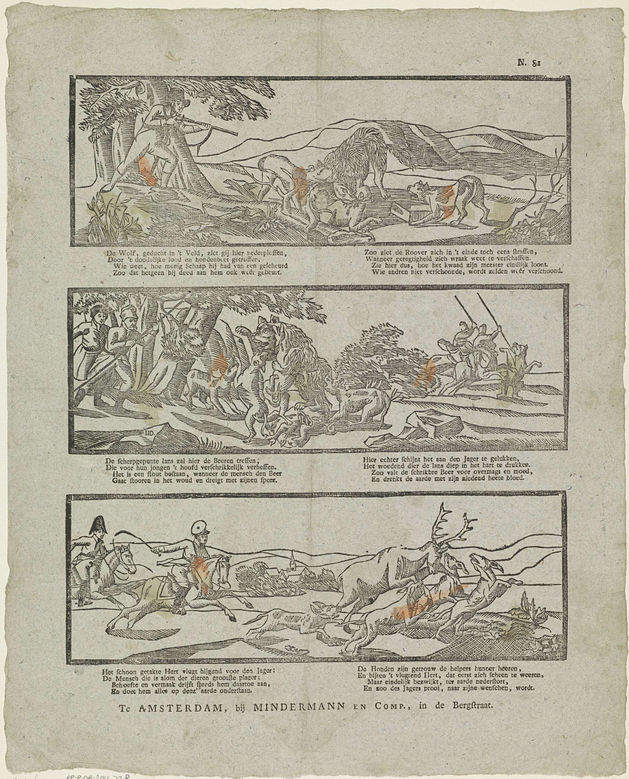 Blad met 3 voorstellingen van jachttaferelen. Onder elke afbeelding een achtregelig vers in twee kolommen. Genummerd rechtsboven: N. 81.