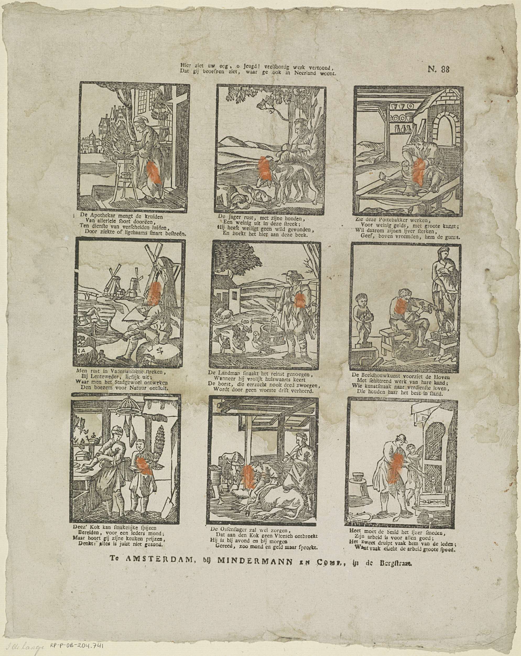 Blad met 9 voorstellingen van ambachtslieden en beroepen, zoals apotheker, jager en slager. Onder elke afbeelding een vierregelig vers. Genummerd rechtsboven: N. 88.