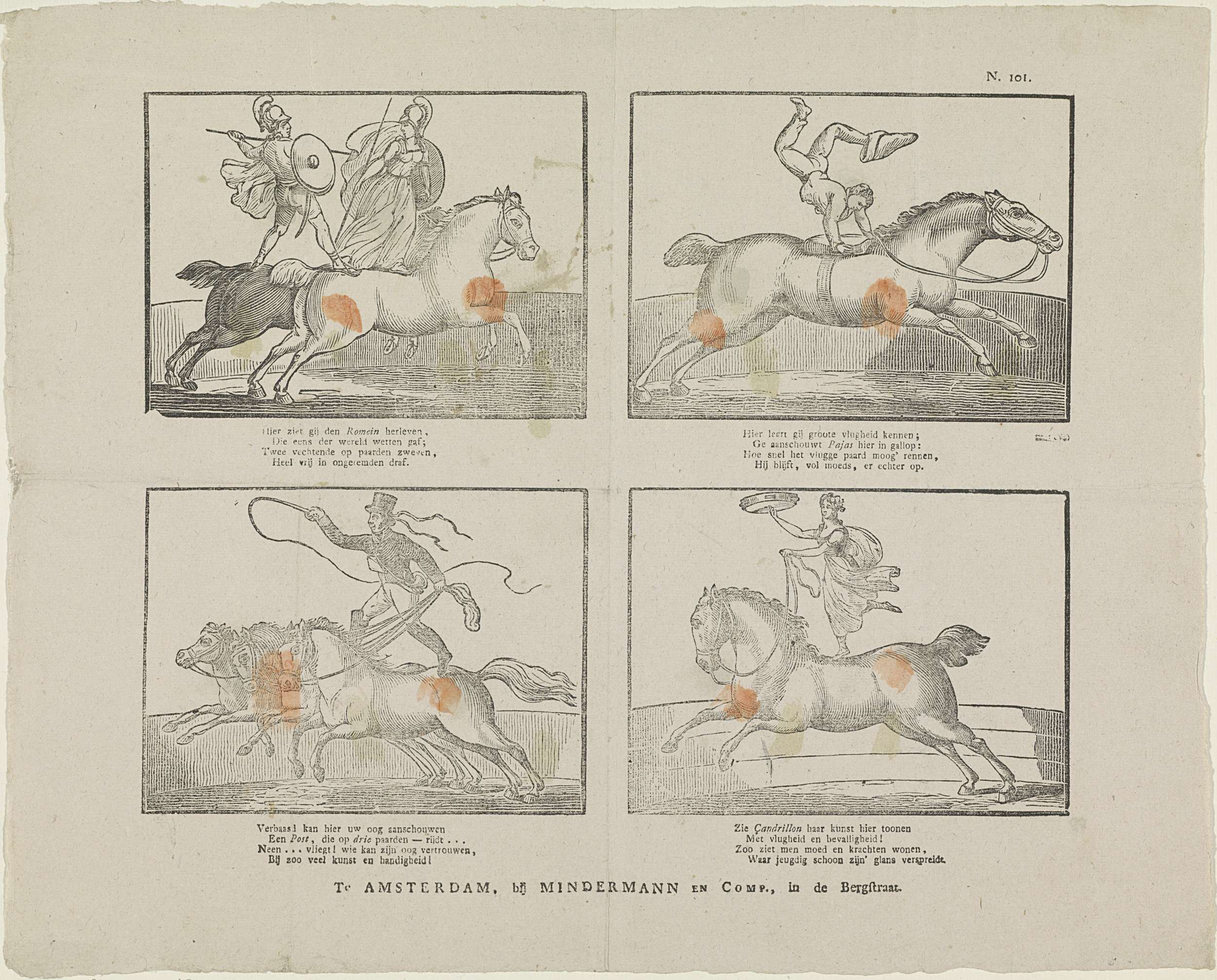 Blad met 4 voorstellingen van acrobaten die verschillende kunsten op een paard uitvoeren. Onder elke afbeelding een vierregelig vers. Genummerd rechtsboven: N. 101.
