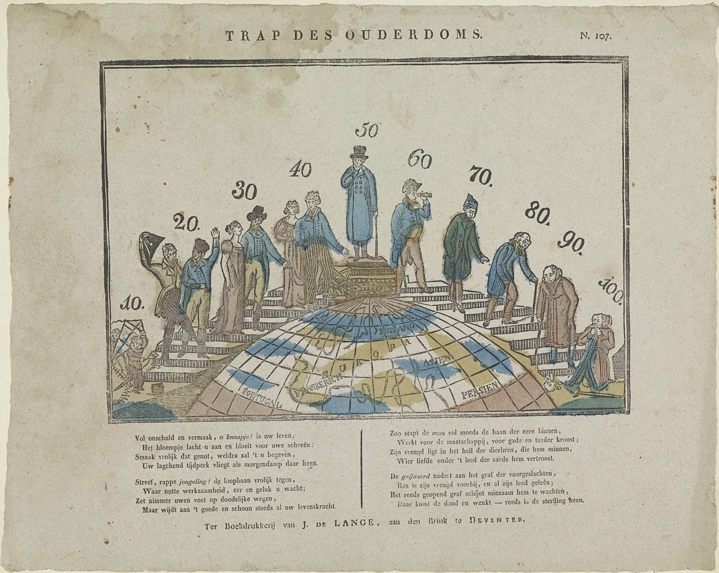 Een trap des ouderdoms: een mannentrap. Op de treden van de trap, lopend over de aardbol (het noordelijk halfrond), staan mannen in de leeftijd van 10 tot 100 jaar. Onder de afbeelding een vers in twee kolommen. Genummerd rechtsboven: N. 107.