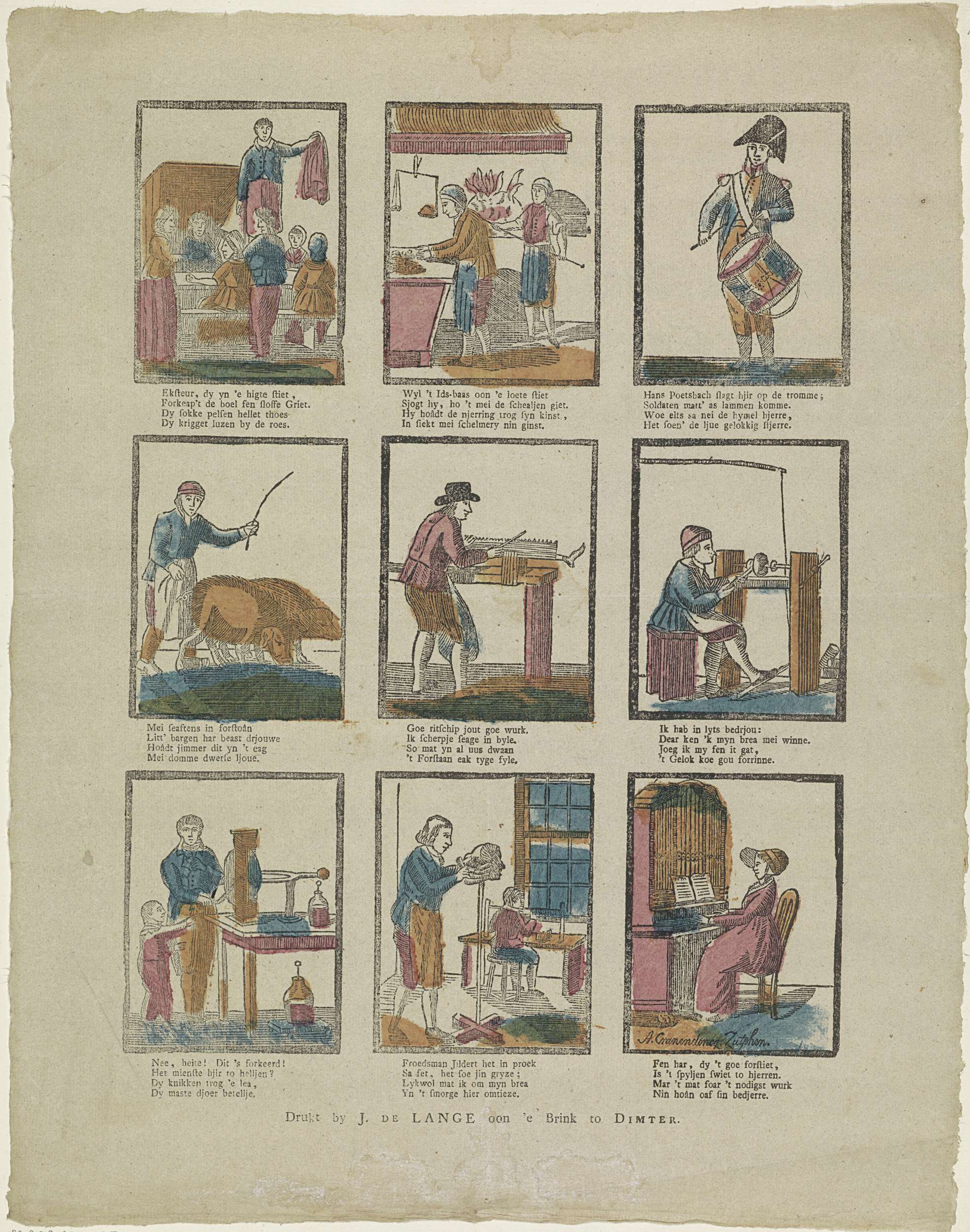 Blad met 9 voorstellingen van ambachtslieden en beroepen, zoals straatverkoper, tamboer, timmerman en pruikenmaker. Onder elke afbeelding een vierregelig vers in het Fries.