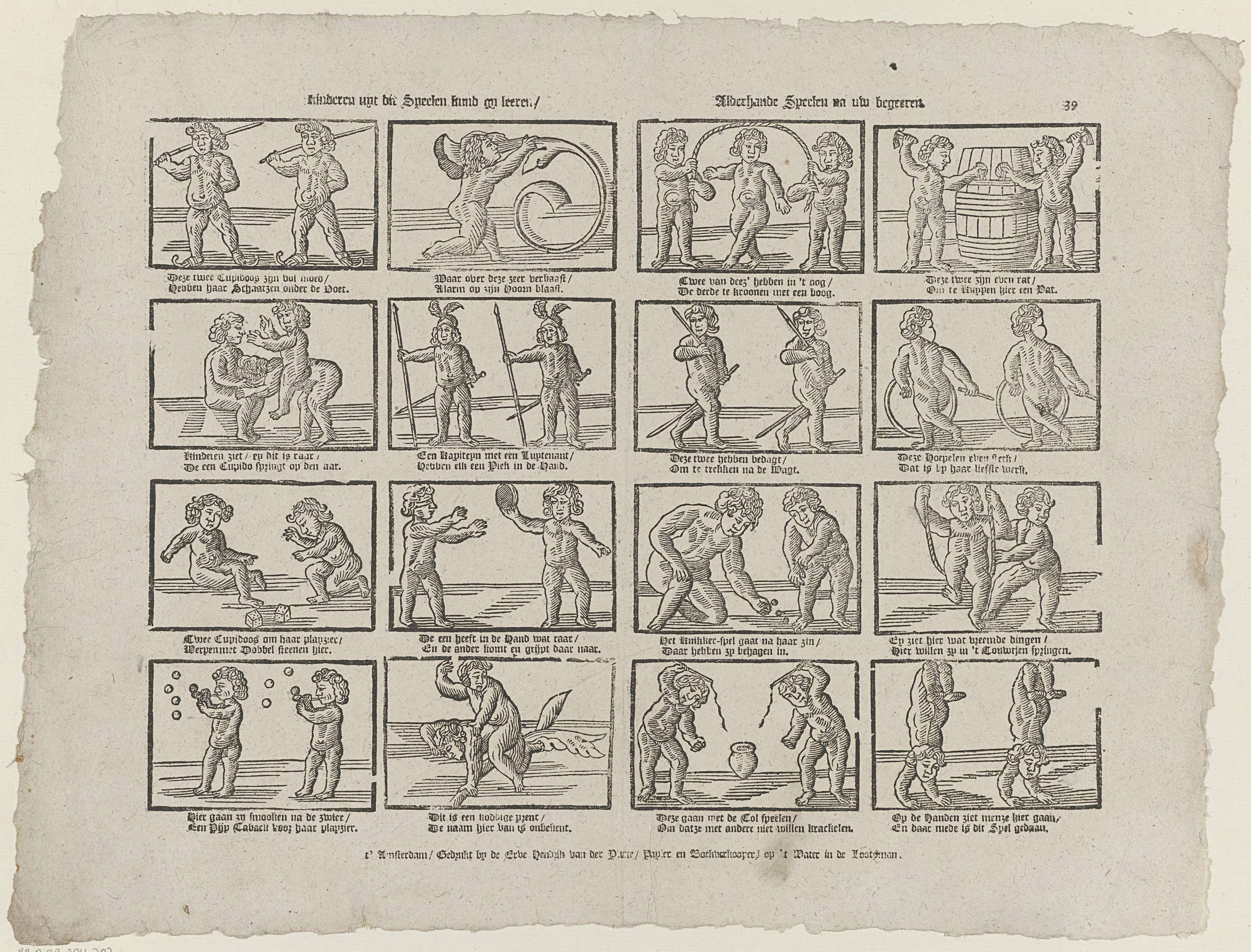 Blad met 16 voorstellingen van kinderspelen en bezigheden voorgesteld met Cupido's, zoals knikkeren, hoepelen en tollen. Onder elke afbeelding een tweeregelig vers. Genummerd rechtsboven: 39.