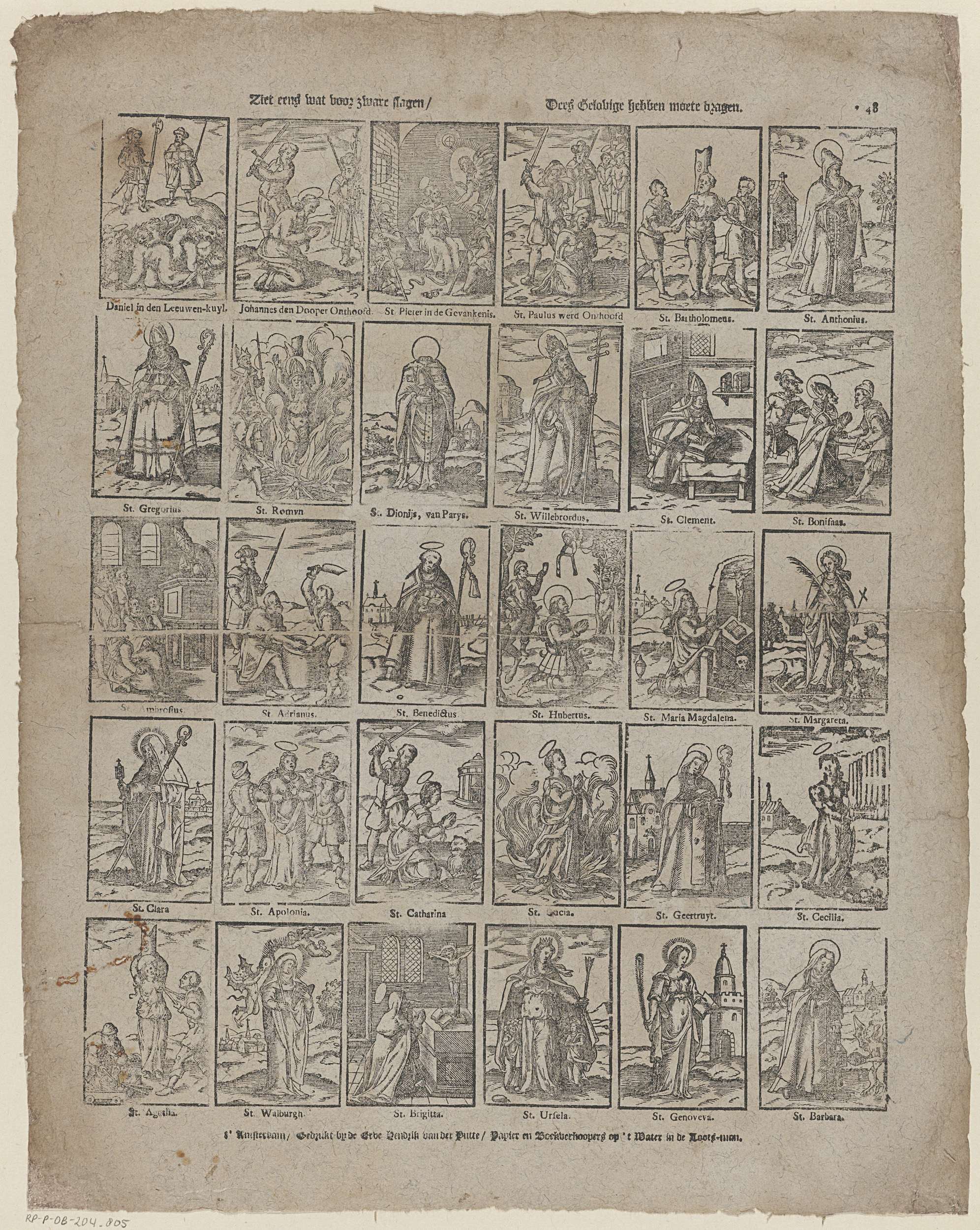 Blad met 30 voorstellingen van heiligen en martelaren. Onder elke afbeelding een onderschrift. Genummerd rechtsboven: *48.