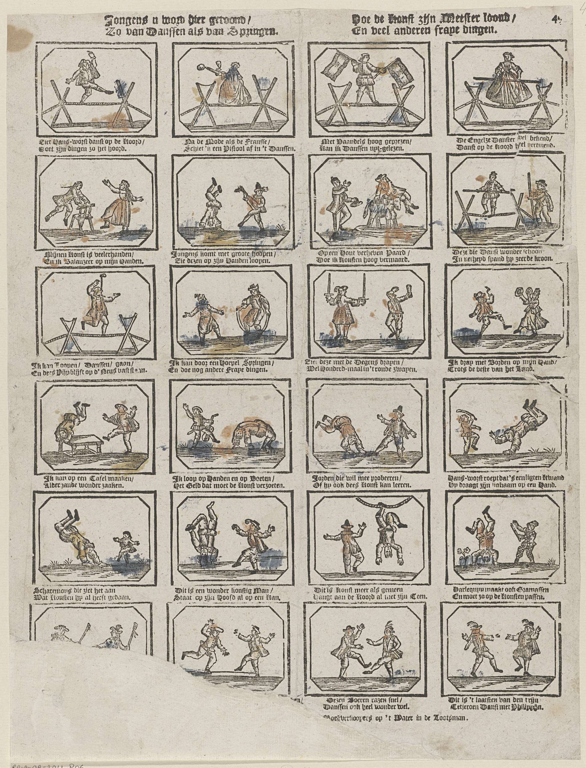 Blad met 36 voorstellingen van artiesten en kunstenmakers, waaronder koorddansers, acrobaten en dansers. Onder elke afbeelding een tweeregelig vers. Genummerd rechtsboven: 49.