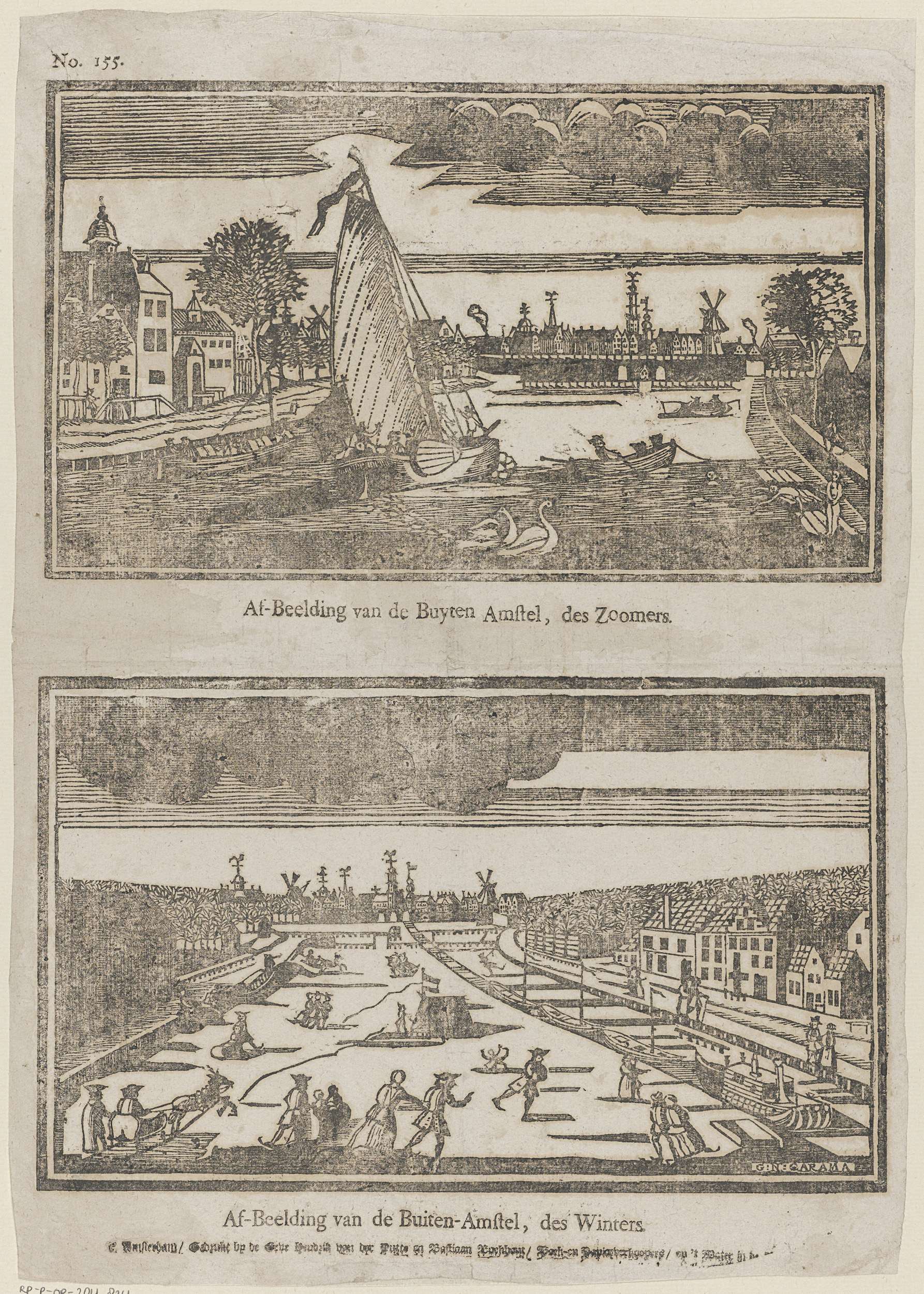 Blad met 2 voorstellingen. Boven een gezicht op de Amstel en Amsterdam in de zomer met boten en zwemmers. Onder een gezicht op de Amstel en Amsterdam met schaatsers en boten varend in een opengebroken vaargeul. Onder elke afbeelding de titel. Genummerd linksboven: No. 155.