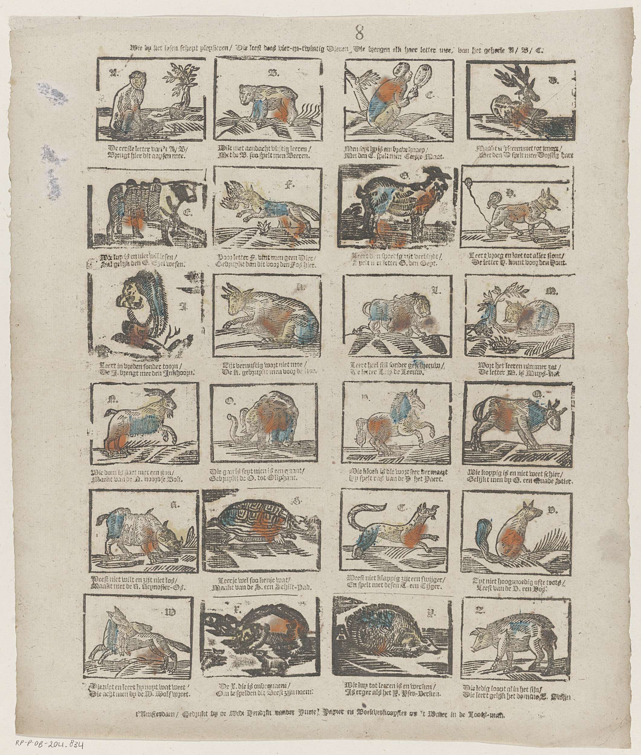 Blad met 24 voorstellingen van de letters van het alfabet geïllustreerd met dieren waarvan de woorden met de betreffende letter beginnen. Onder elke afbeelding een tweeregelig vers. Genummerd midden boven: 8.