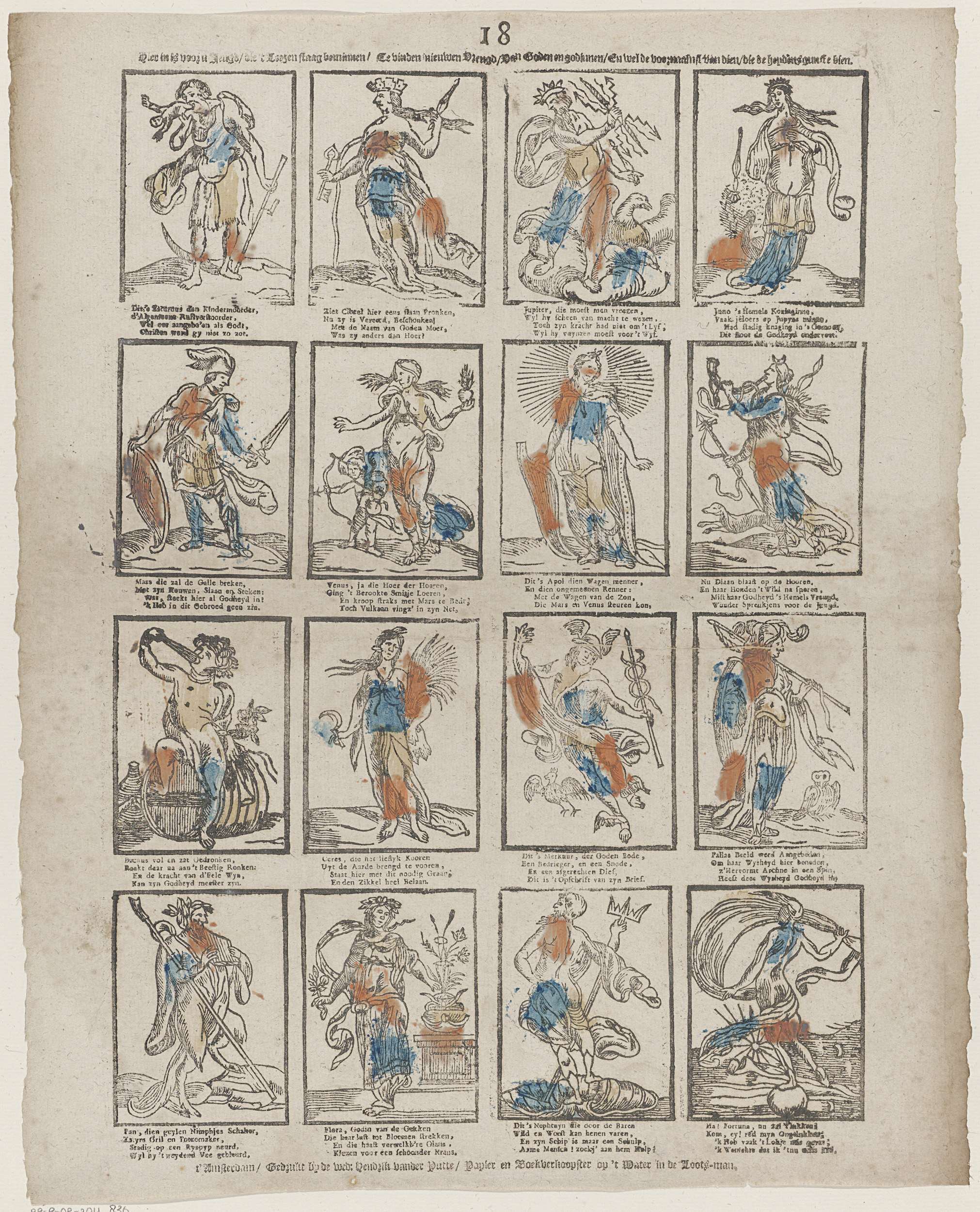 Blad met 16 voorstellingen van mythologische figuren, zoals Jupiter, Juno, Mars en Pan. Onder elke afbeelding een vierregelig vers. Genummerd midden boven: 18.