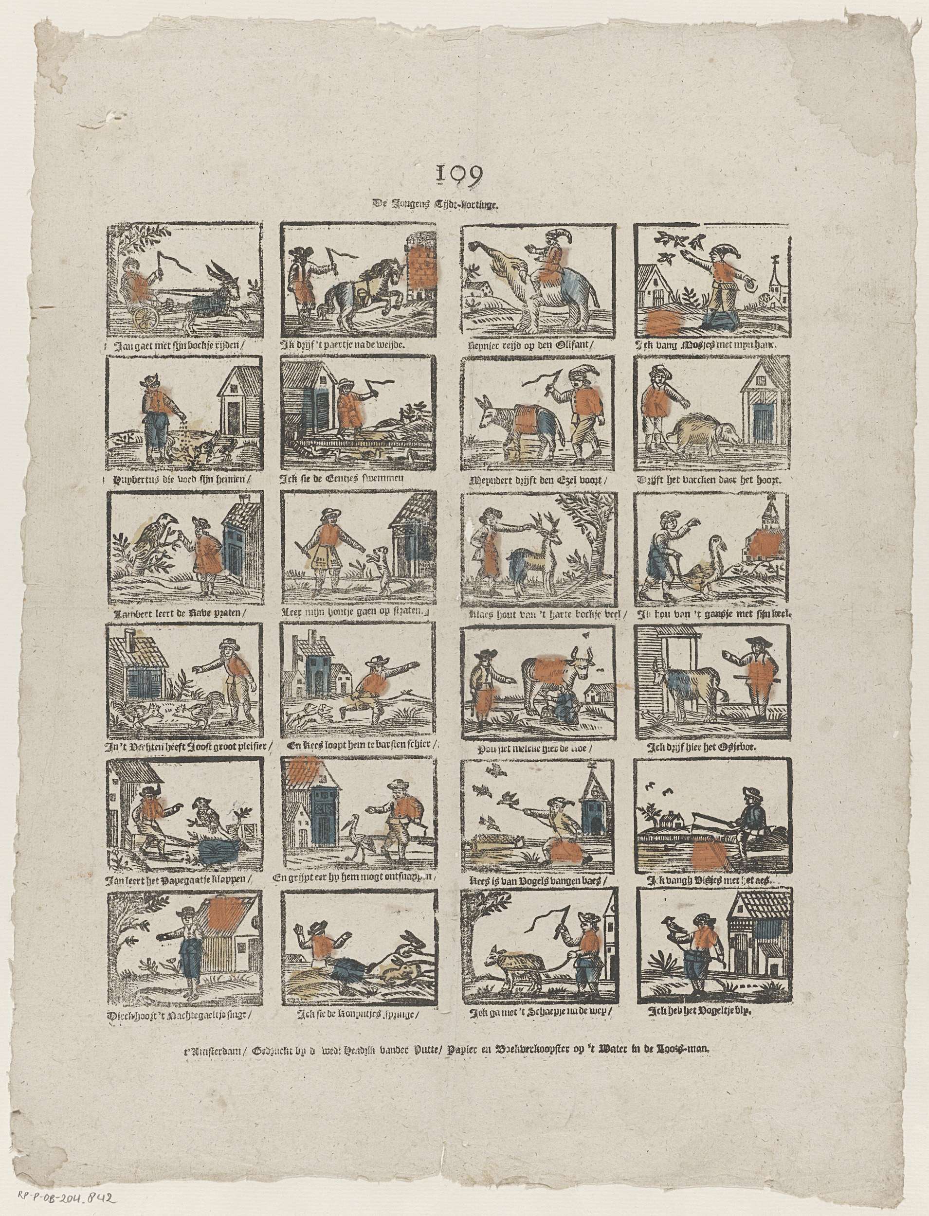 Blad met 24 voorstellingen van bezigheden met dieren, waaronder kippen voeren, rijden op een olifant en luisteren naar een zingende nachtegaal. Onder elke afbeelding een onderschrift. Genummerd midden boven: 109.