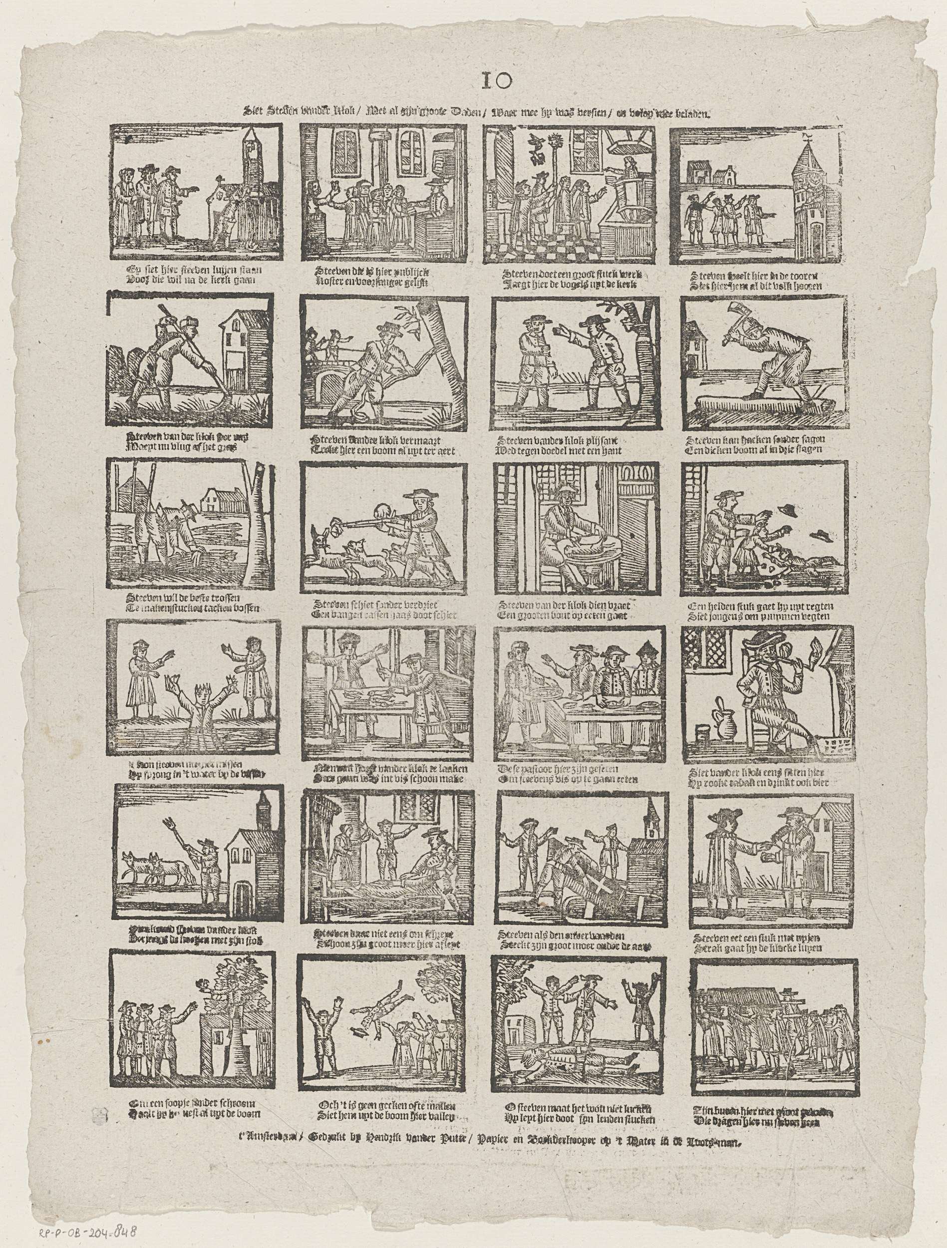 Blad met 24 voorstellingen over het leven van Steven van der Klok. Onder elke afbeelding een tweeregelig vers. Genummerd midden boven: 10.