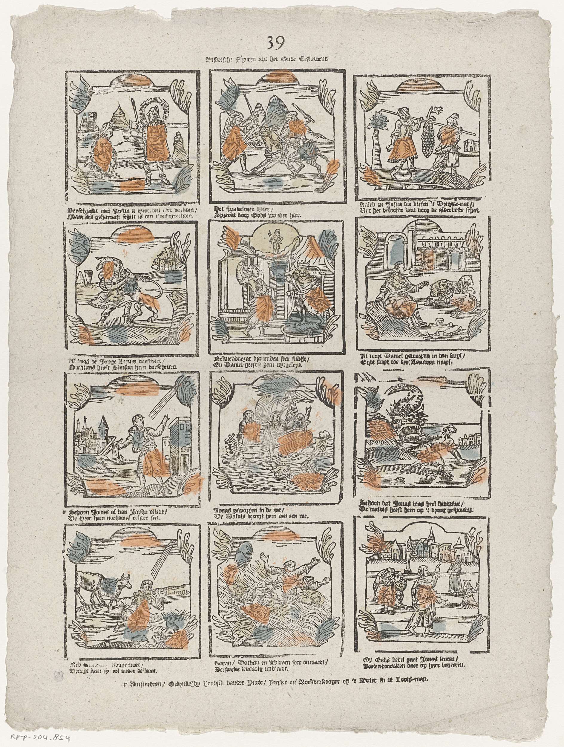 Blad met 12 voorstellingen van verhalen uit het Oude Testament, zoals Simson en de leeuw en Jona die op het droge wordt geworpen. Onder elke afbeelding een tweeregelig vers. Genummerd midden boven: 39.