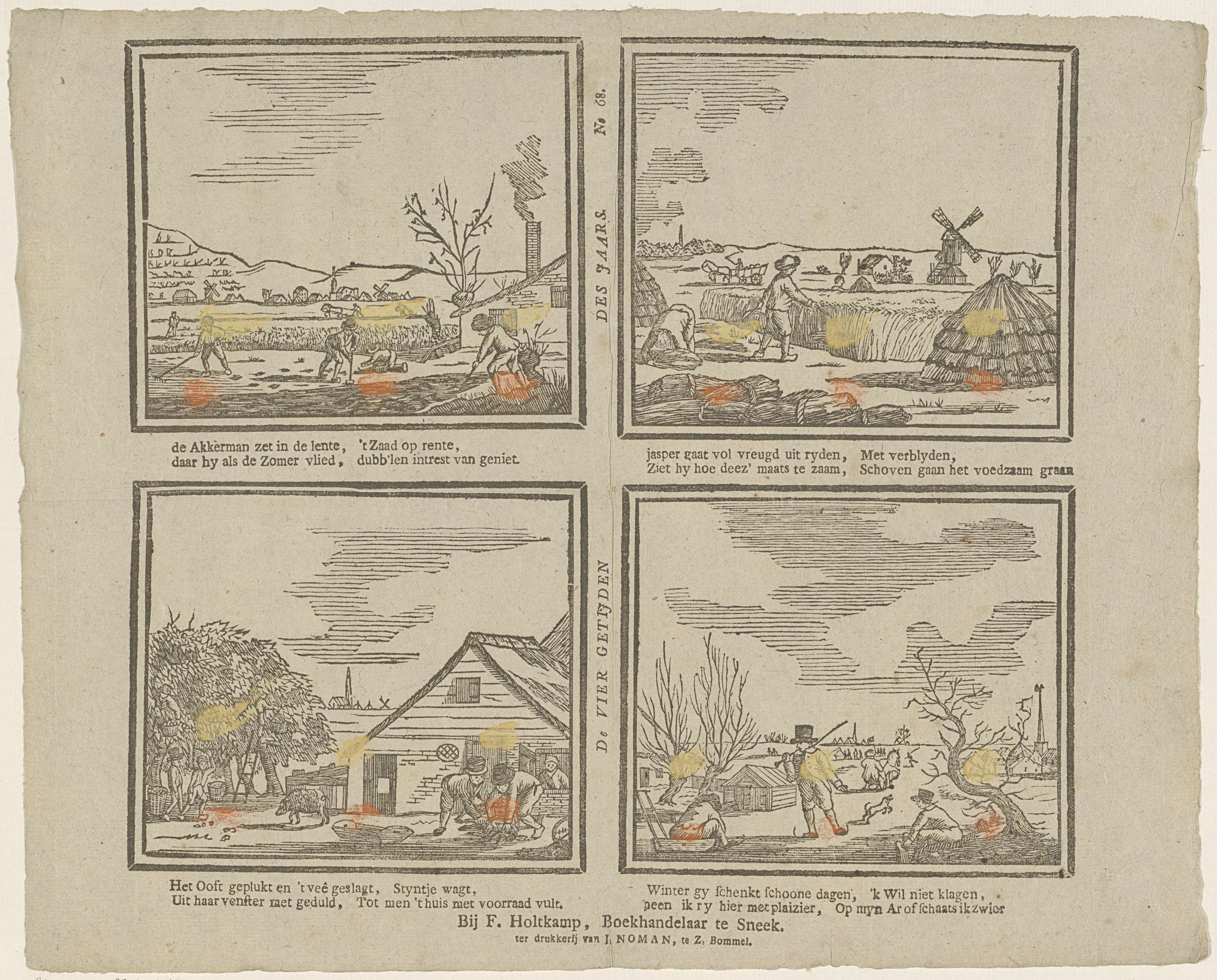 Blad met 4 voorstellingen van de vier jaargetijden en bijbehorende activiteiten. Onder elke afbeelding een tweeregelig vers. Genummerd midden boven: No. 68.