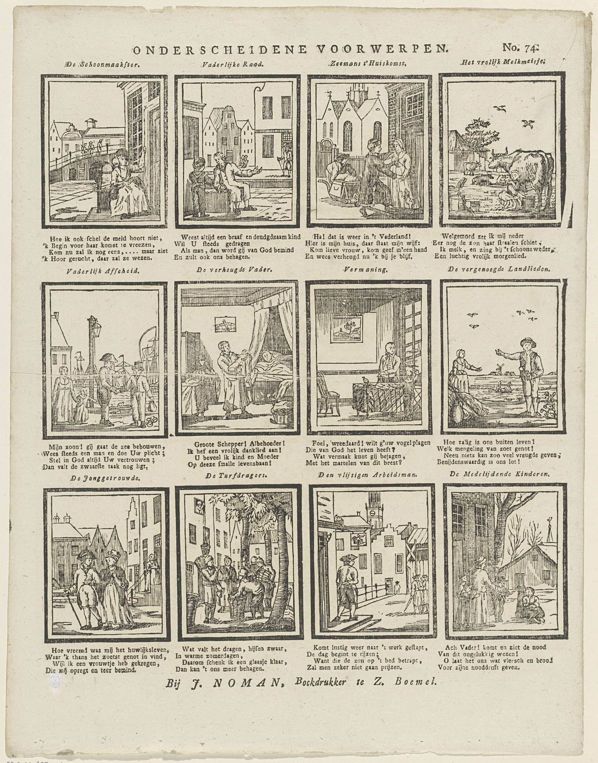 Blad met 12 voorstellingen van verschillende figuren en bezigheden. Onder elke afbeelding een vierregelig vers, boven elke afbeelding een titel. Genummerd rechtsboven: No. 74.