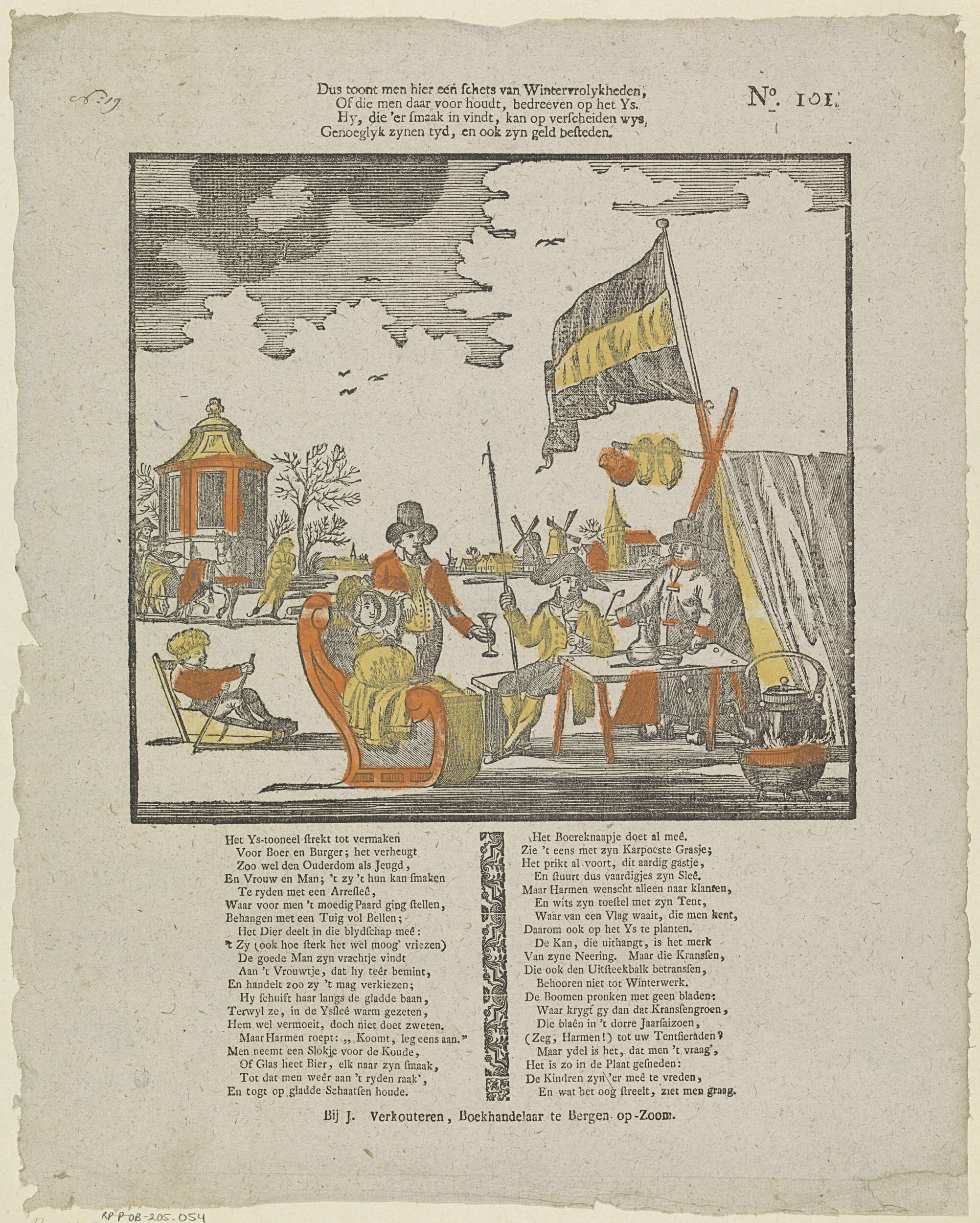 Blad met een grote voorstelling van een winters tafereel, met mensen die sleeën en schaatsen en een verkoper van warme drank. Onder de afbeelding een vers in twee kolommen. Genummerd rechtsboven: No. 101.