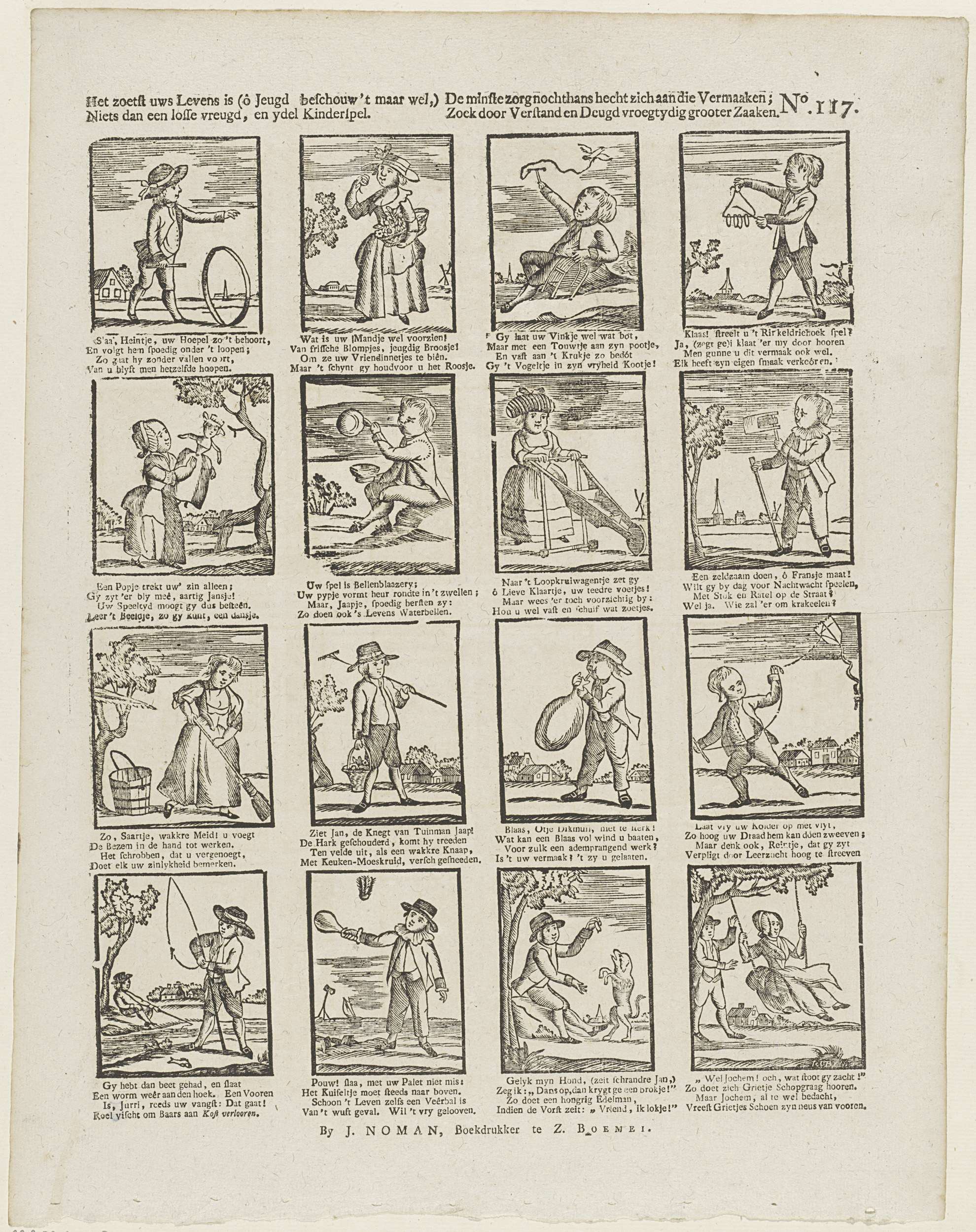 Blad met 16 voorstellingen van kinderspelen, zoals hoepelen, met de pop spelen en bellenblazen. Onder elke afbeelding een vierregelig vers. Genummerd rechtsboven: No. 117.