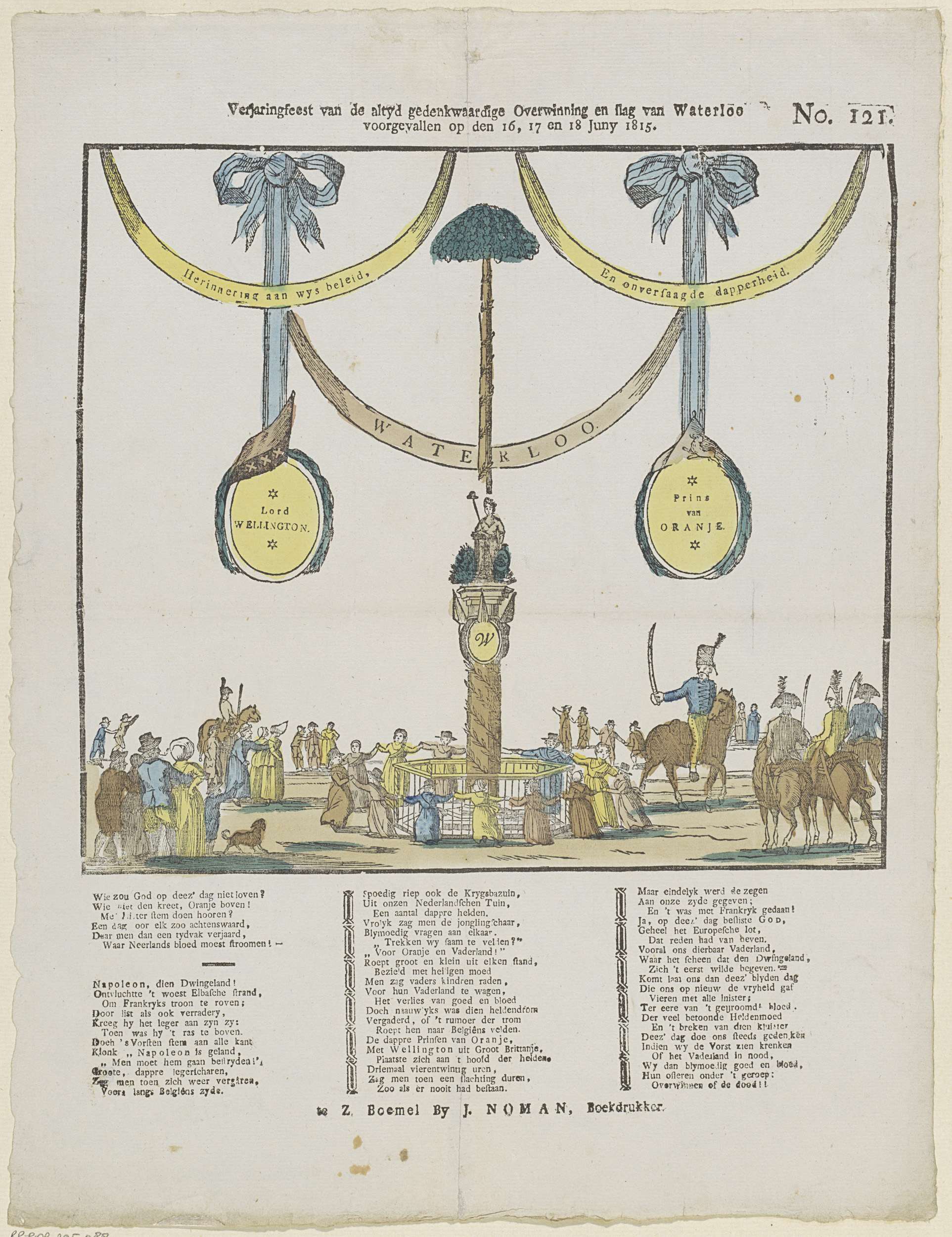 Blad met een grote voorstelling van een herdenkingsbijeenkomt om de Slag bij Waterloo te herdenken. In het midden danst een groep kinderen rond een zuil met een beeld erop. Daar omheen staat een groep mensen toe te kijken. Boven hangen banderollen en medaillons aan linten met teksten en namen erop. Onder de afbeelding een vers ...