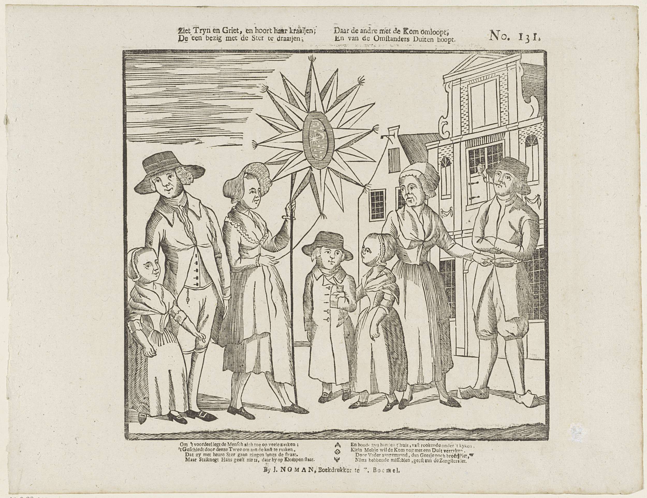 Ziet Tryn en Griet, en hoort haar kraaijen; / De een bezig met de ster te draaijen; / Daar de andre met de kom omloopt, / En van de omstanders duiten hoopt