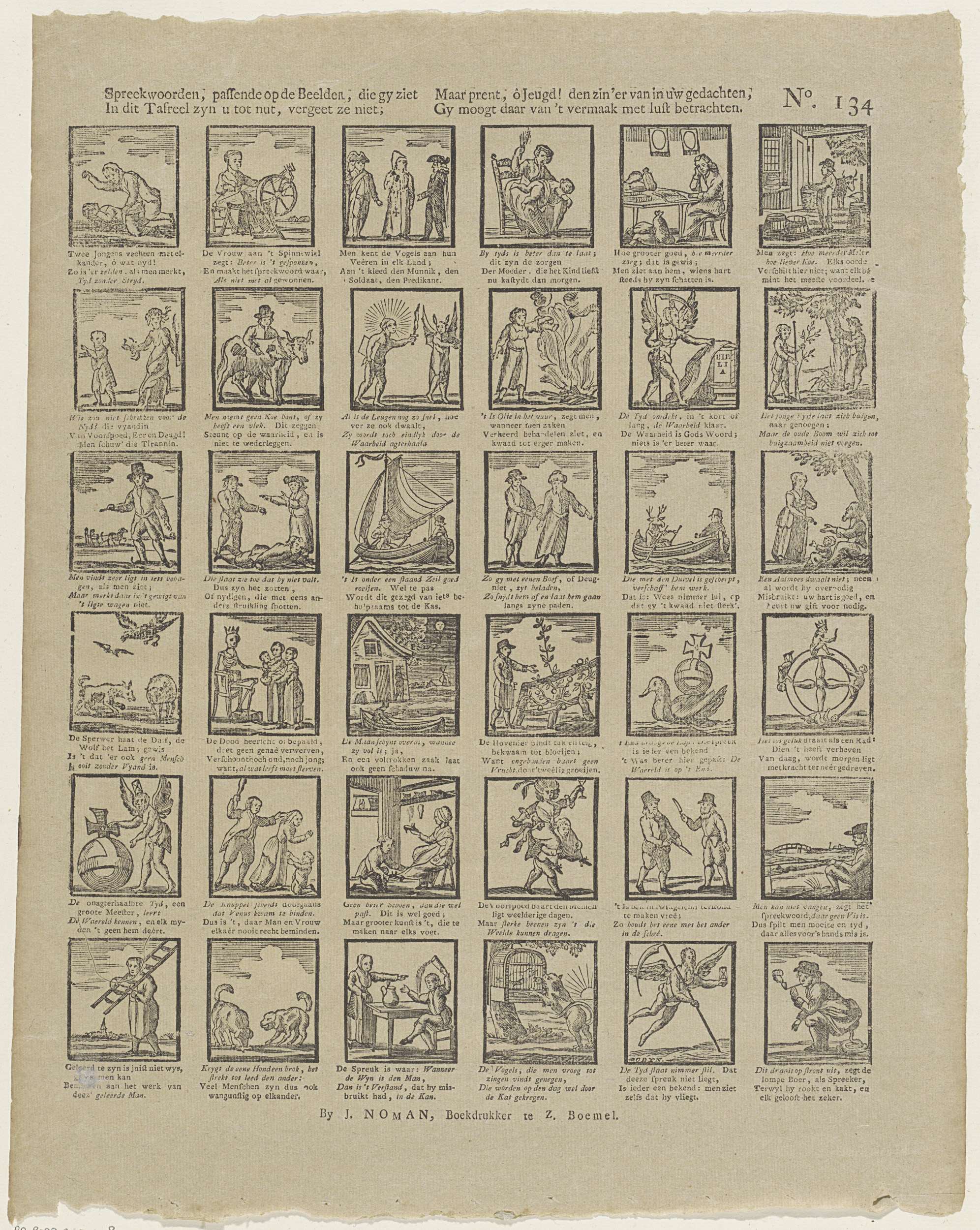 Blad met 36 verbeeldingen van spreekwoorden. Onder elke afbeelding een vierregelig vers. Genummerd rechtsboven: No. 134.