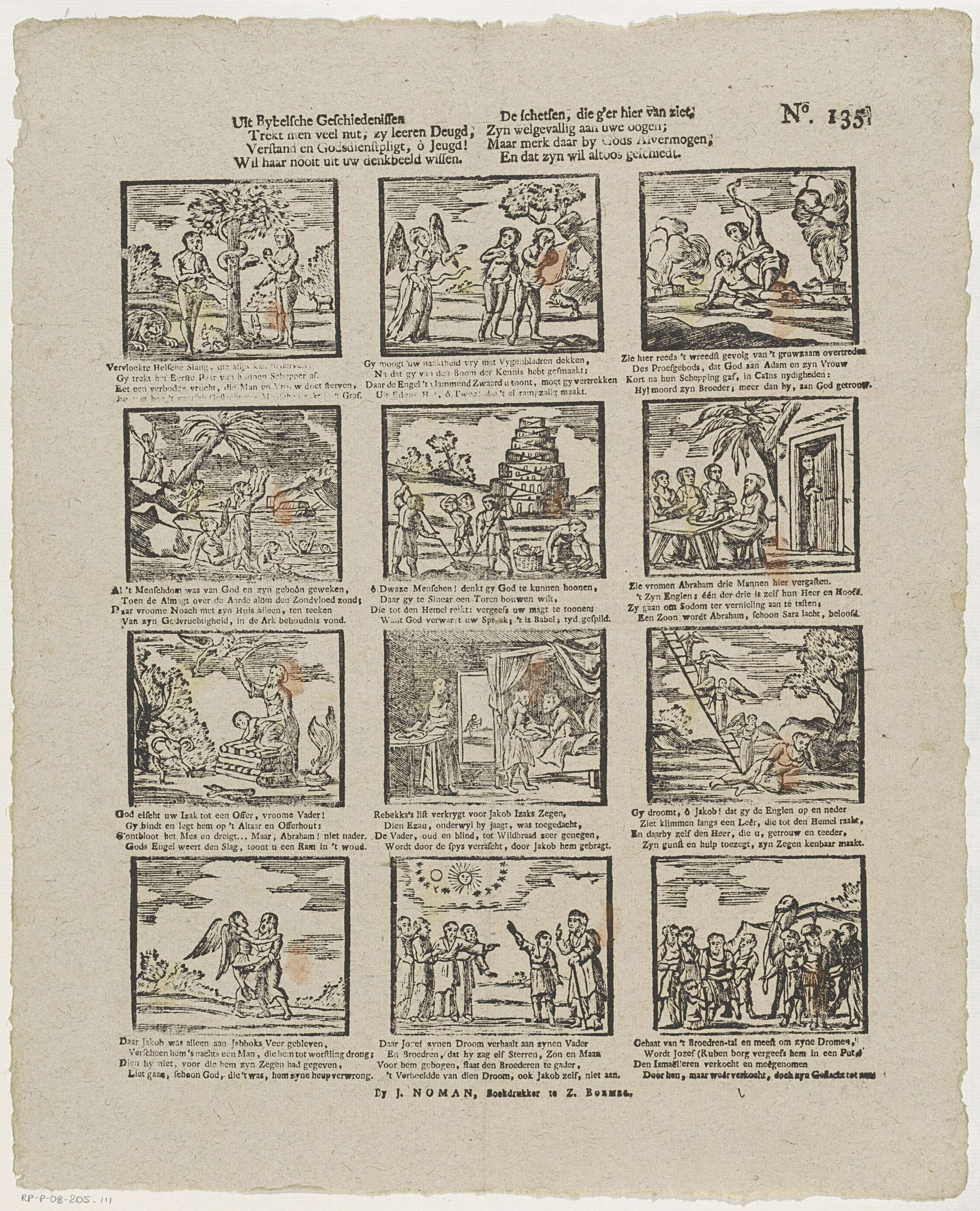 Blad met 12 voorstellingen van verhalen uit het Oude Testament, zoals de verdrijving van Adam en Eva uit het paradijs en de dood van Abel. Onder elke afbeelding een vierregelig vers. Genummerd rechtsboven: No. 135.