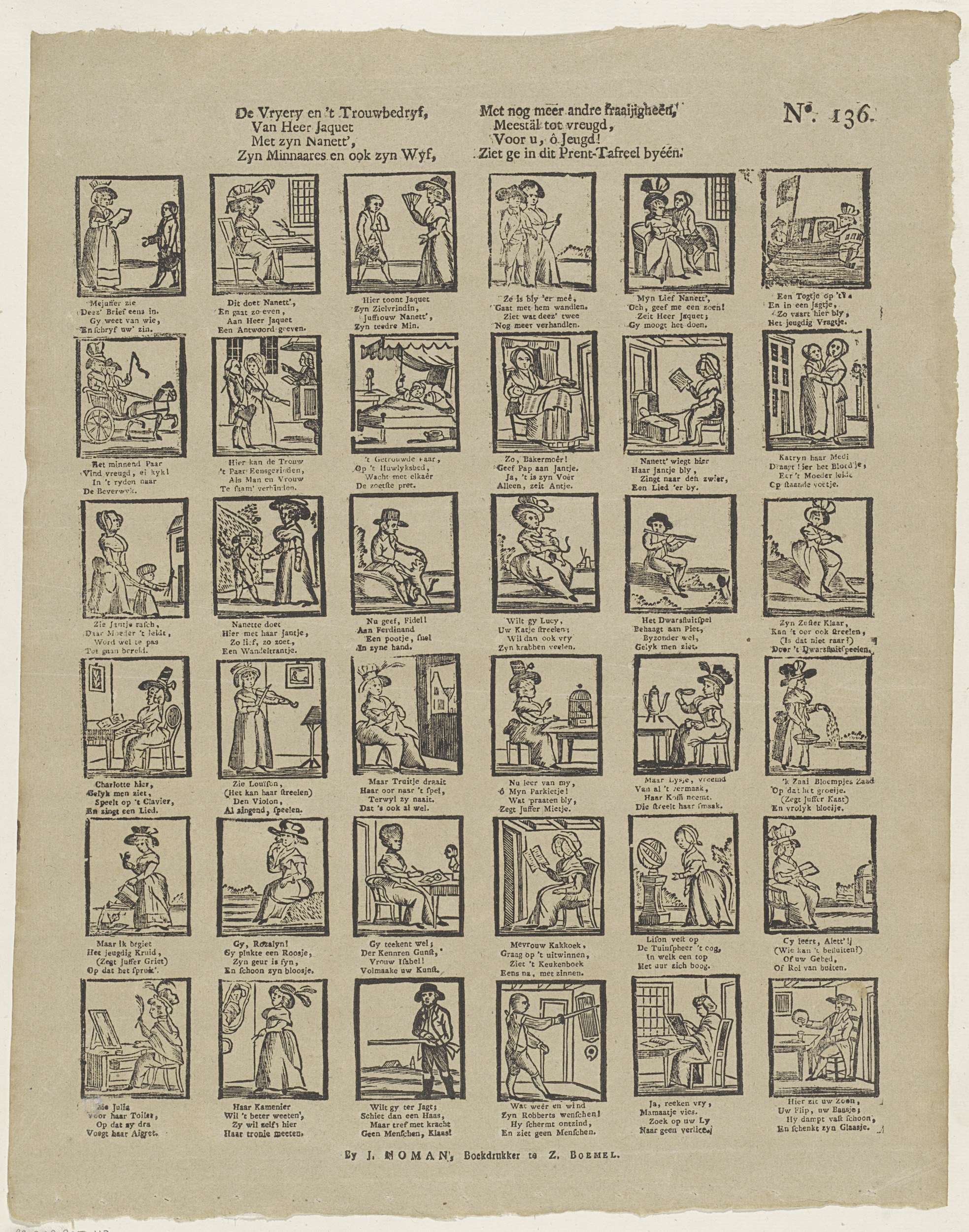 Blad met 36 voorstellingen over het huwelijk van Heer Jaquet en zijn liefje Nanett. Onder elke afbeelding een vierregelig vers. Genummerd rechtsboven: No. 136.