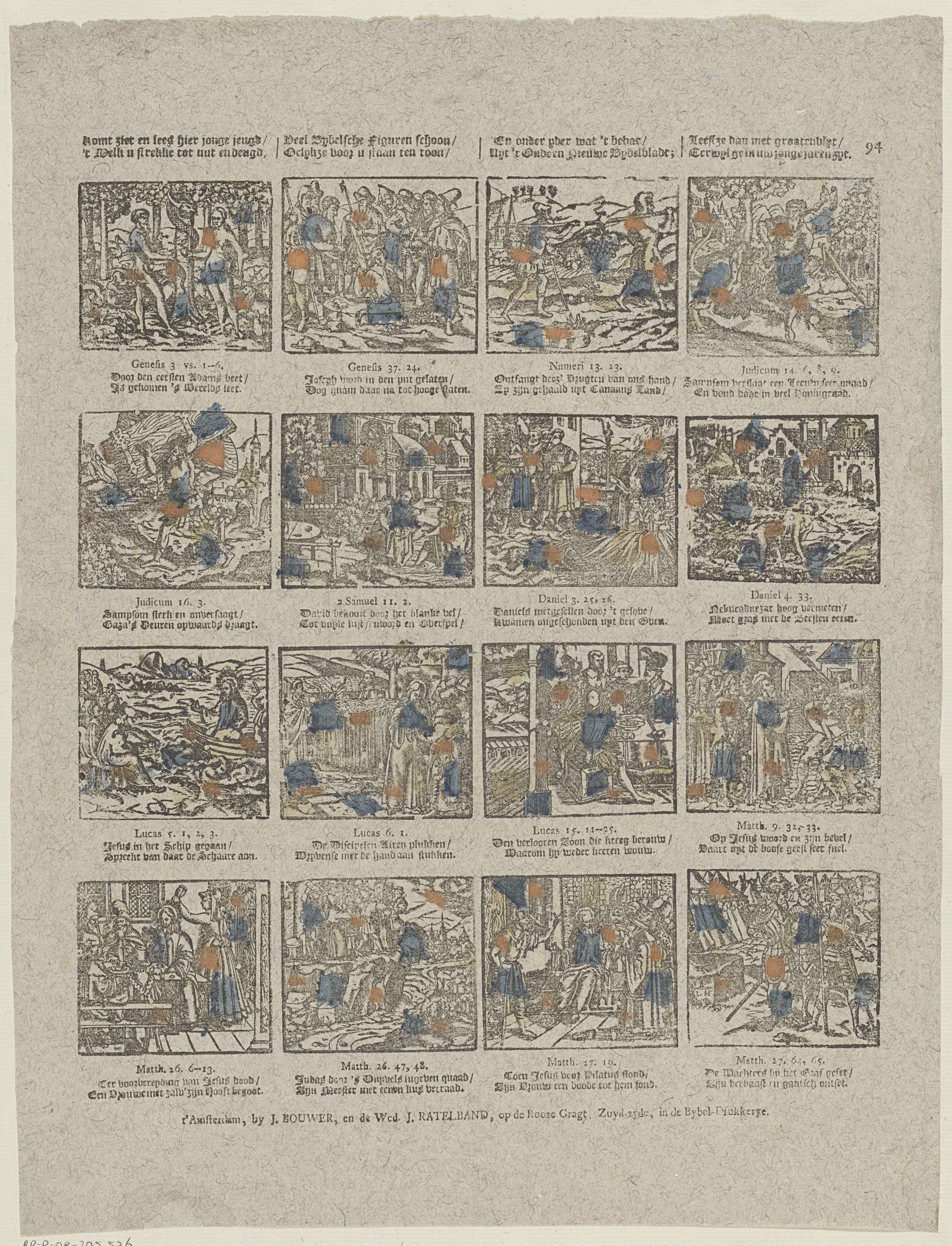 Blad met 16 voorstellingen van verhalen uit het Oude Testament. Onder elke afbeelding een tweeregelig vers en een verwijzing naar de bijbehorende Bijbeltekst. Genummerd rechtsboven: 94.