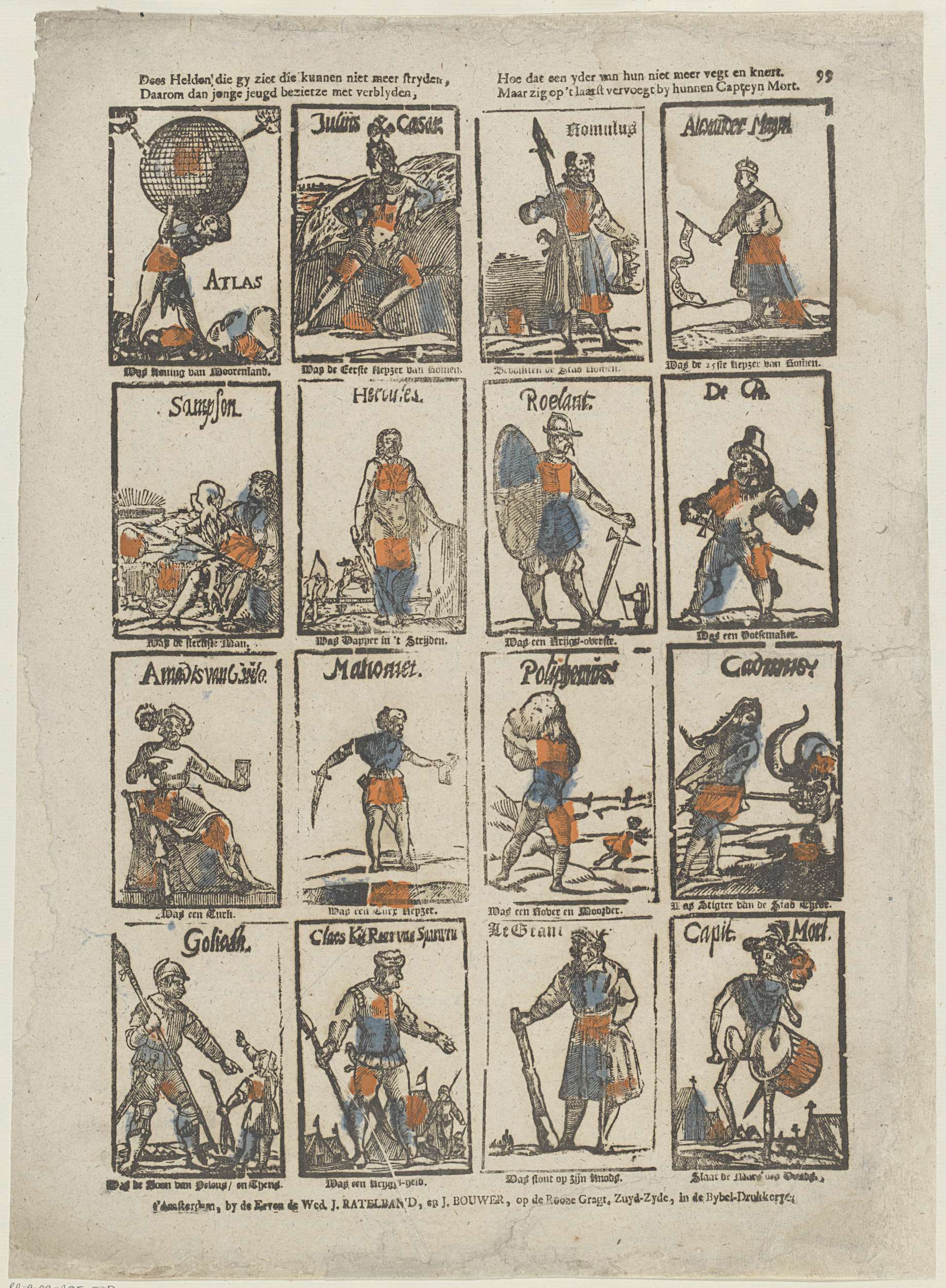 Blad met 16 voorstellingen van historische en mythologische figuren. Onder elke afbeelding een onderschrift in boekdruk, in elke afbeelding de naam van de figuur in houtsnede. Genummerd rechtsboven: 99.