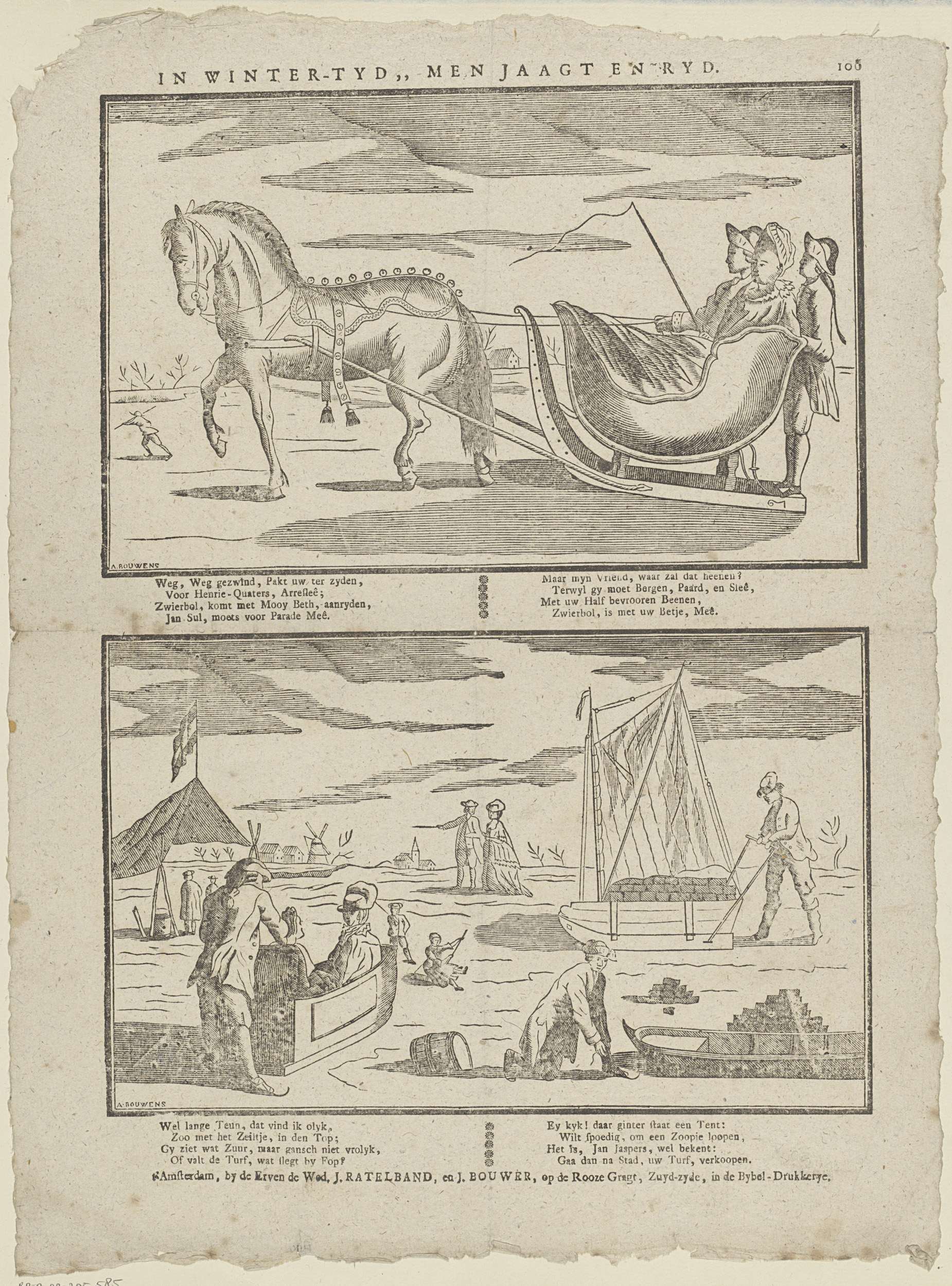 Blad met 2 wintertaferelen. Boven: mensen in een slee die wordt voortgetrokken door een paard. Onder: mensen die spullen over het ijs verplaatsen met behulp van sleeën. Onder elke voorstelling een achtregelig vers in twee kolommen. Genummerd rechtsboven: 106.