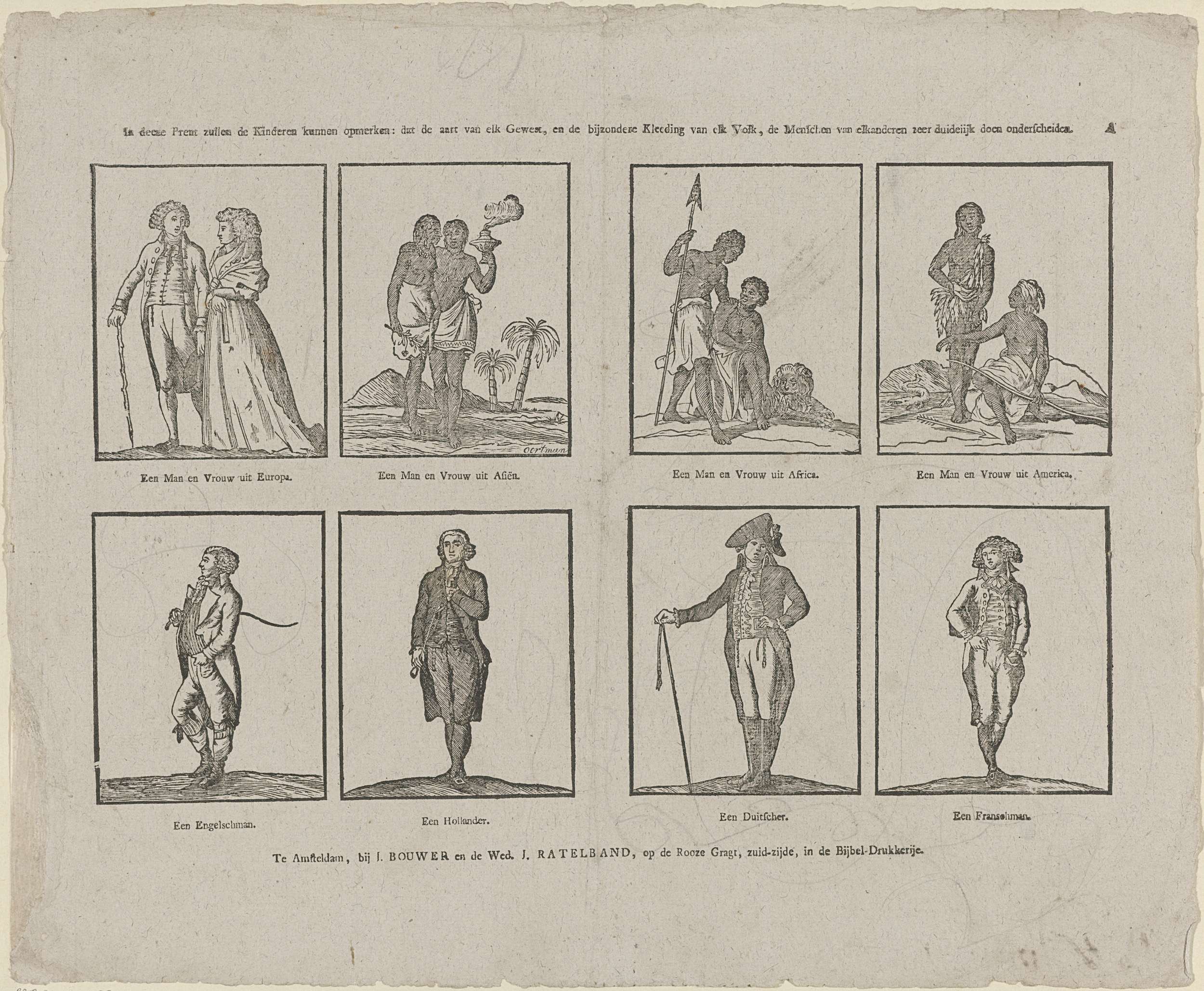 Blad met 8 voorstellingen van de kleding van verschillende nationaliteiten en volkeren. Onder elke afbeelding een onderschrift. Genummerd rechtsboven: A.