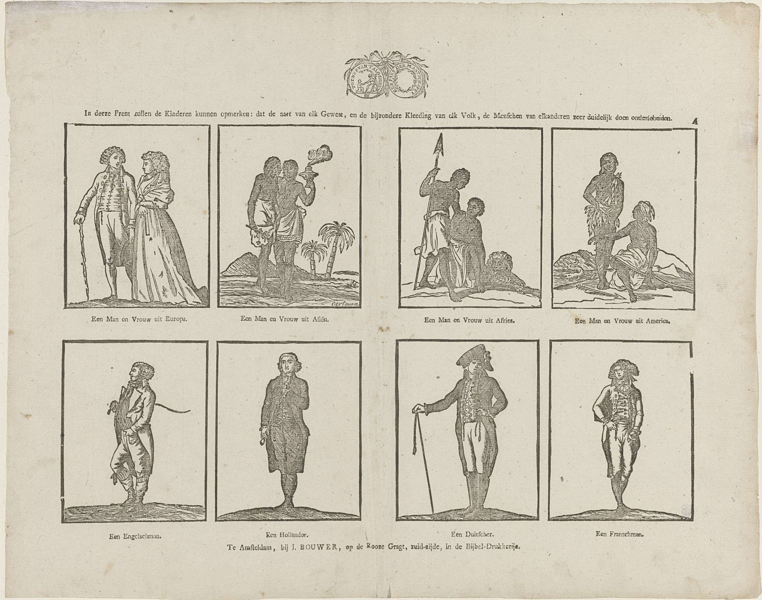 Blad met 8 voorstellingen van de kleding van verschillende nationaliteiten en volkeren. Midden boven het zegel van de Maatschappij tot Nut van 't Algemeen. Onder elke afbeelding een onderschrift. Genummerd rechtsboven: A.