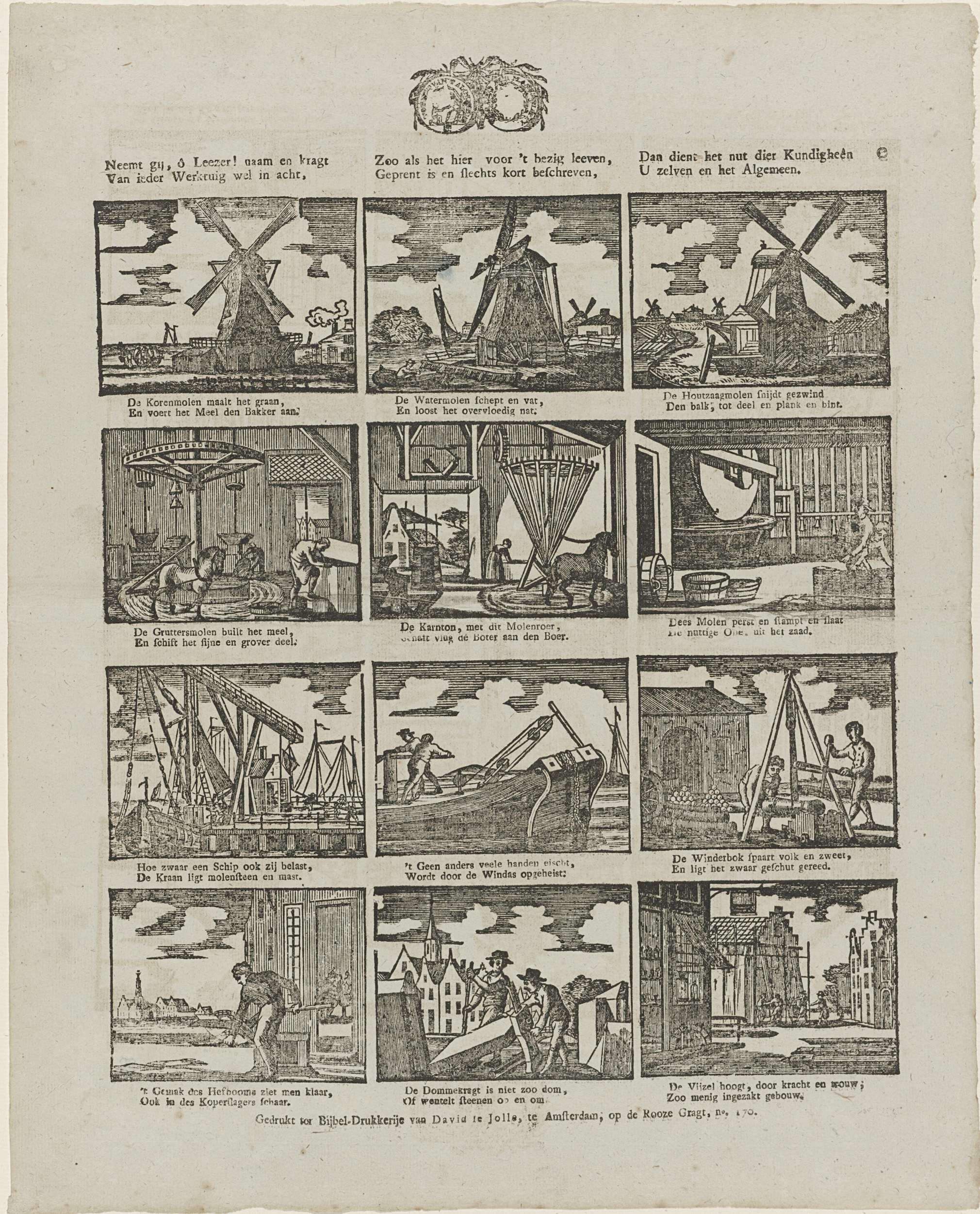 Blad met 12 voorstellingen van verschillende werktuigen en machines. Midden boven het zegel van de Maatschappij tot Nut van 't Algemeen. Onder elke afbeelding een onderschrift. Genummerd rechtsboven: C.