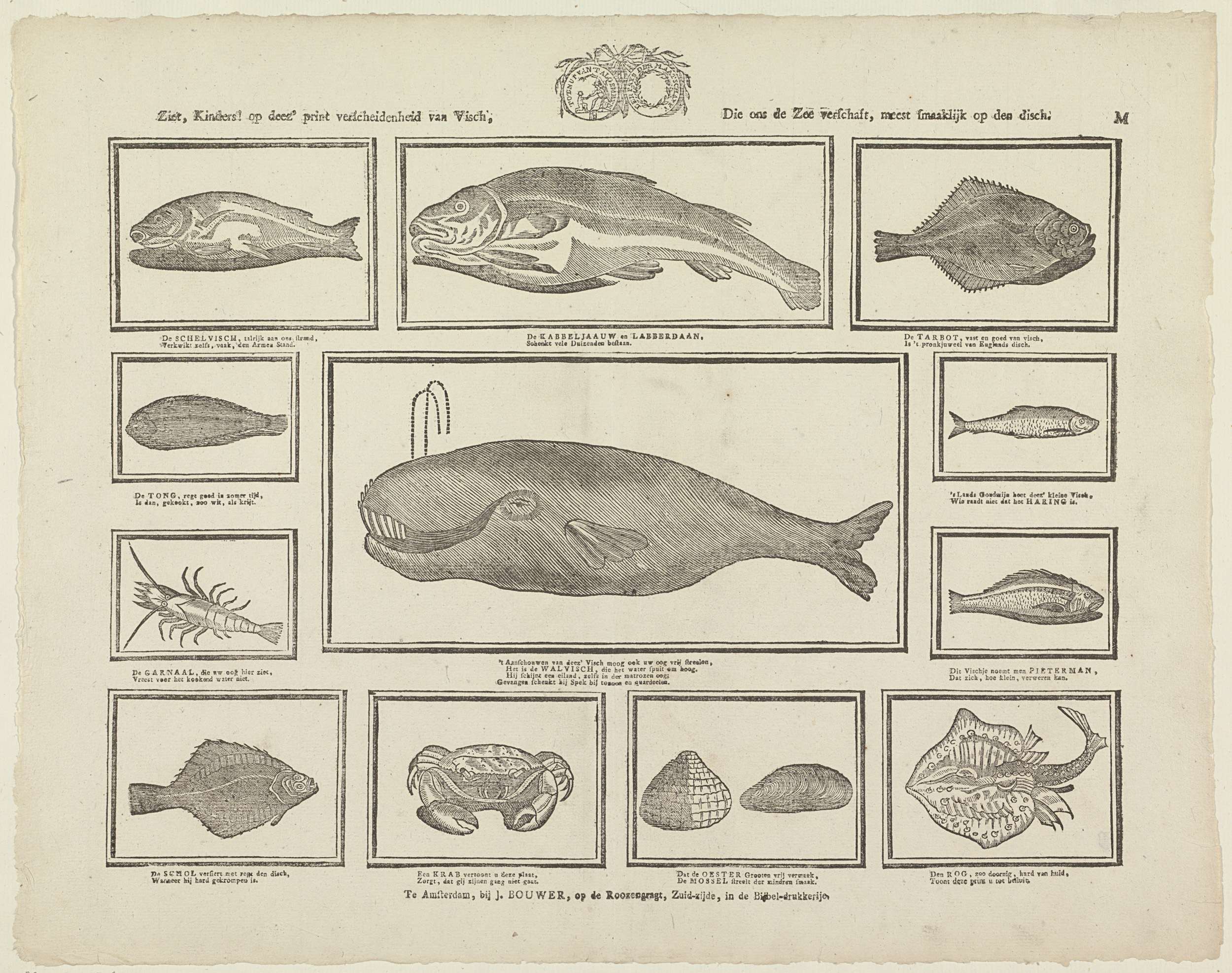 Blad met 12 voorstellingen van vissen, een walvis en schaaldieren. Midden boven het zegel van de Maatschappij tot Nut van 't Algemeen. Onder elke afbeelding een tweeregelig vers met de naam van het dier. Genummerd rechtsboven: M.