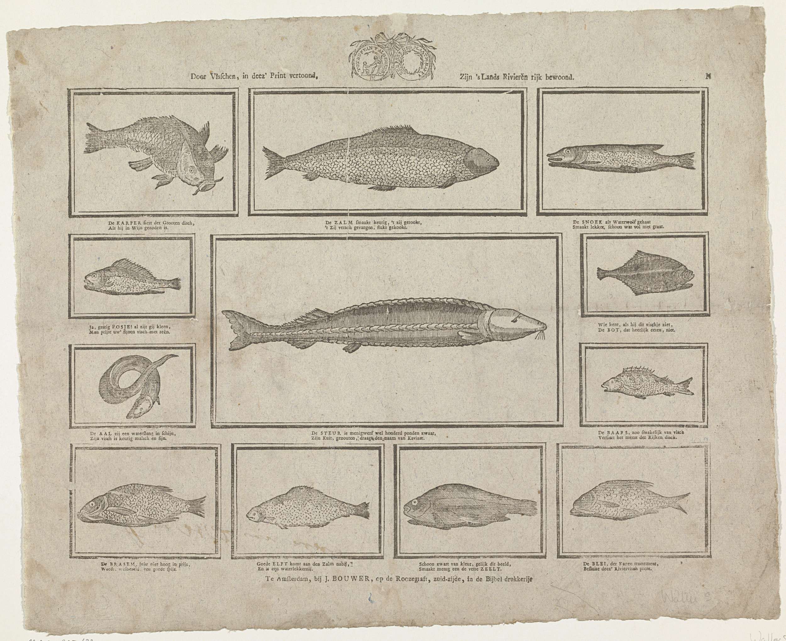 Blad met 12 voorstellingen van zoetwatervissen (behalve de bot). Midden boven het zegel van de Maatschappij tot Nut van 't Algemeen. Onder elke afbeelding een tweeregelig vers met de naam van het dier. Genummerd rechtsboven: N.