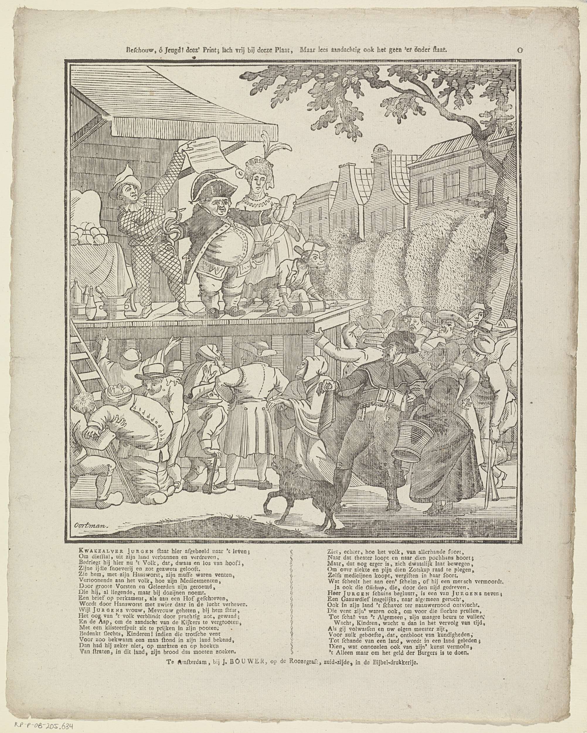 Blad met een grote voorstelling van kwakzalver Jurgen op de kermis. Op een podium voor het publiek prijst de kwakzalver samen met zijn handlangers, de harlekijn Hansworst, zijn vrouw en een aap met een klisteerspuit, zijn medicamenten aan. Onder de voorstelling een vers in twee kolommen. Genummerd rechtsboven: O.