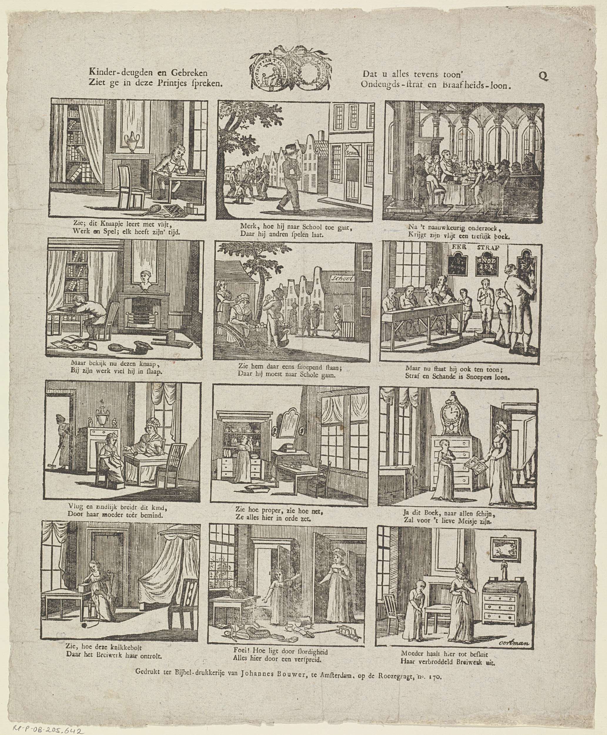 Blad met 12 voorstellingen van de beloning van gehoorzame kinderen en de bestraffing van ongehoorzame kinderen. Midden boven het zegel van de Maatschappij tot Nut van 't Algemeen. Onder elke afbeelding een tweeregelig vers. Genummerd rechtsboven: Q.