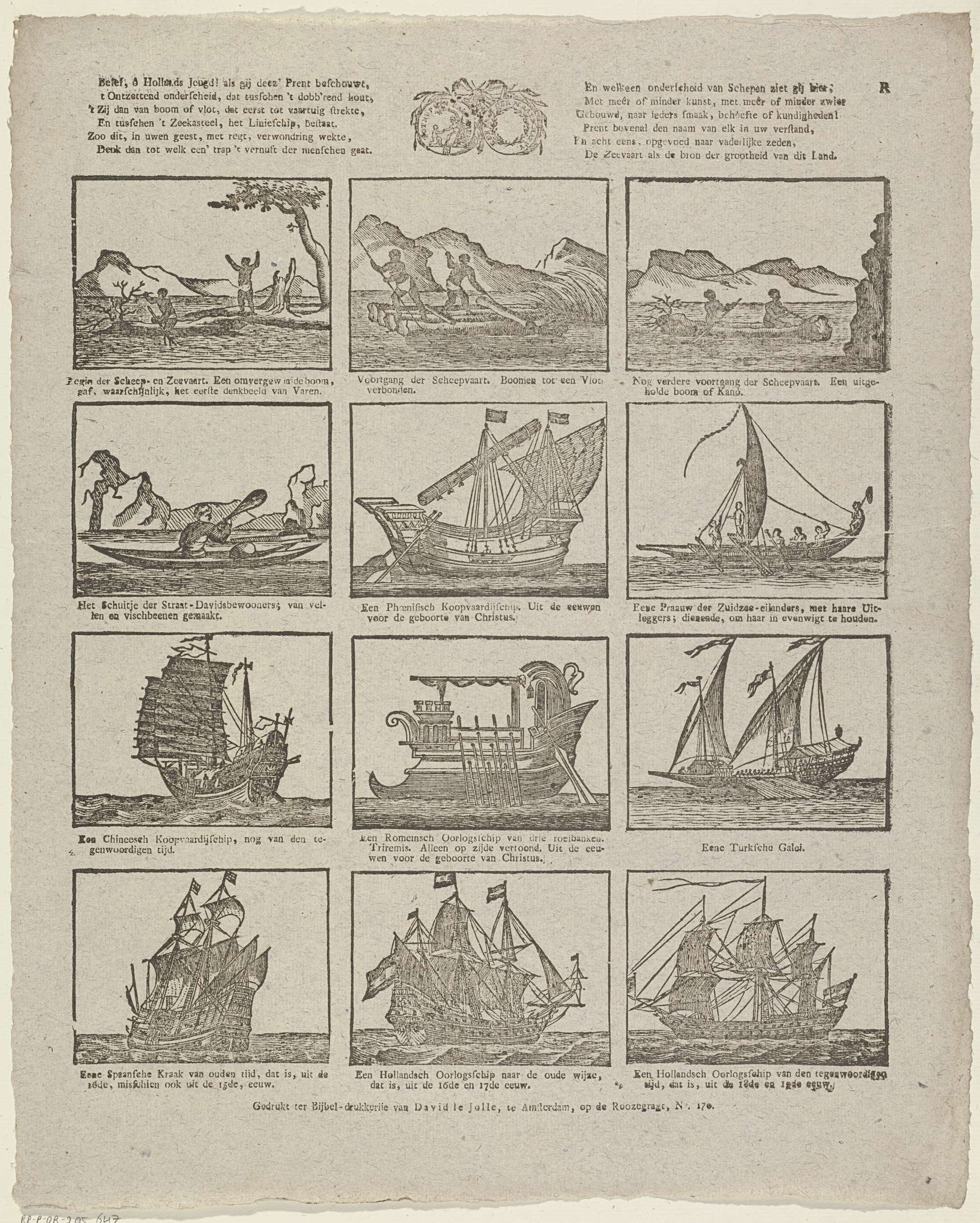 Blad met 12 voorstellingen van vaartuigen, zoals een simpele boomstamkano en een Hollands oorlogsschip. Bovenaan twee zesregelige verzen. Midden boven het zegel van de Maatschappij tot Nut van 't Algemeen. Onder elke afbeelding een tweeregelig onderschrift. Genummerd rechtsboven: R.