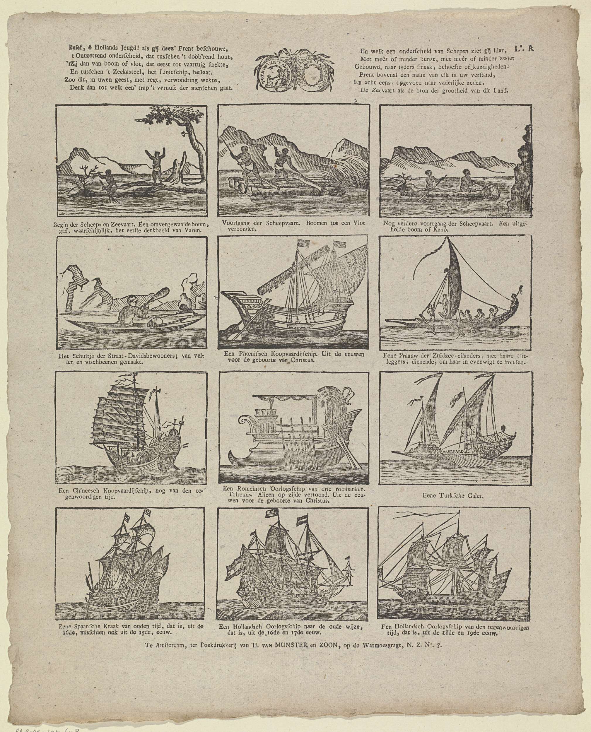 Blad met 12 voorstellingen van vaartuigen, zoals een simpele boomstamkano en een Hollands oorlogsschip. Bovenaan twee zesregelige verzen. Midden boven het zegel van de Maatschappij tot Nut van 't Algemeen. Onder elke afbeelding een tweeregelig onderschrift. Genummerd rechtsboven: L.R.
