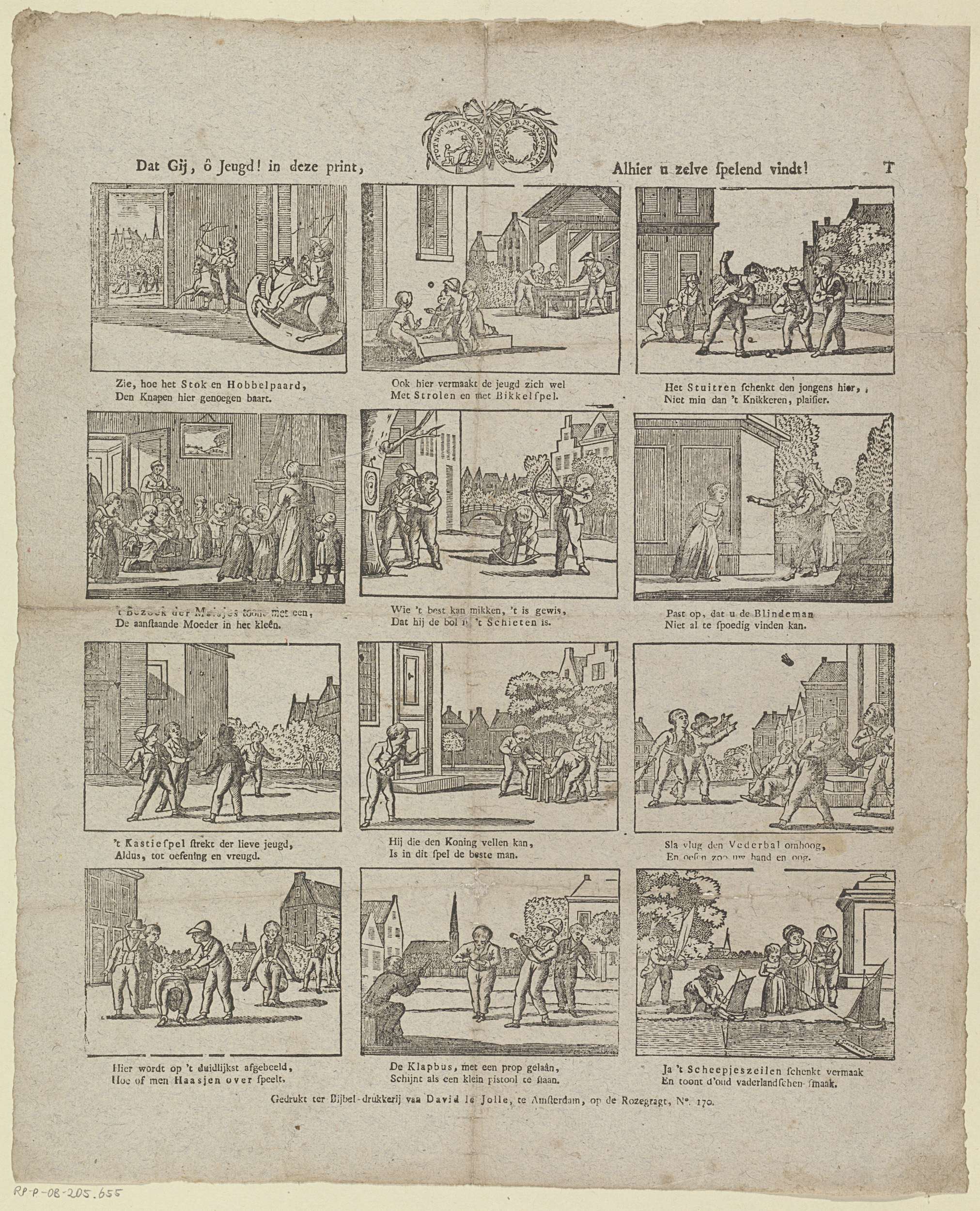 Blad met 12 voorstellingen van kinderspelen. Midden boven het zegel van de Maatschappij tot Nut van 't Algemeen. Onder elke afbeelding een tweeregelig vers. Genummerd rechtsboven: T.