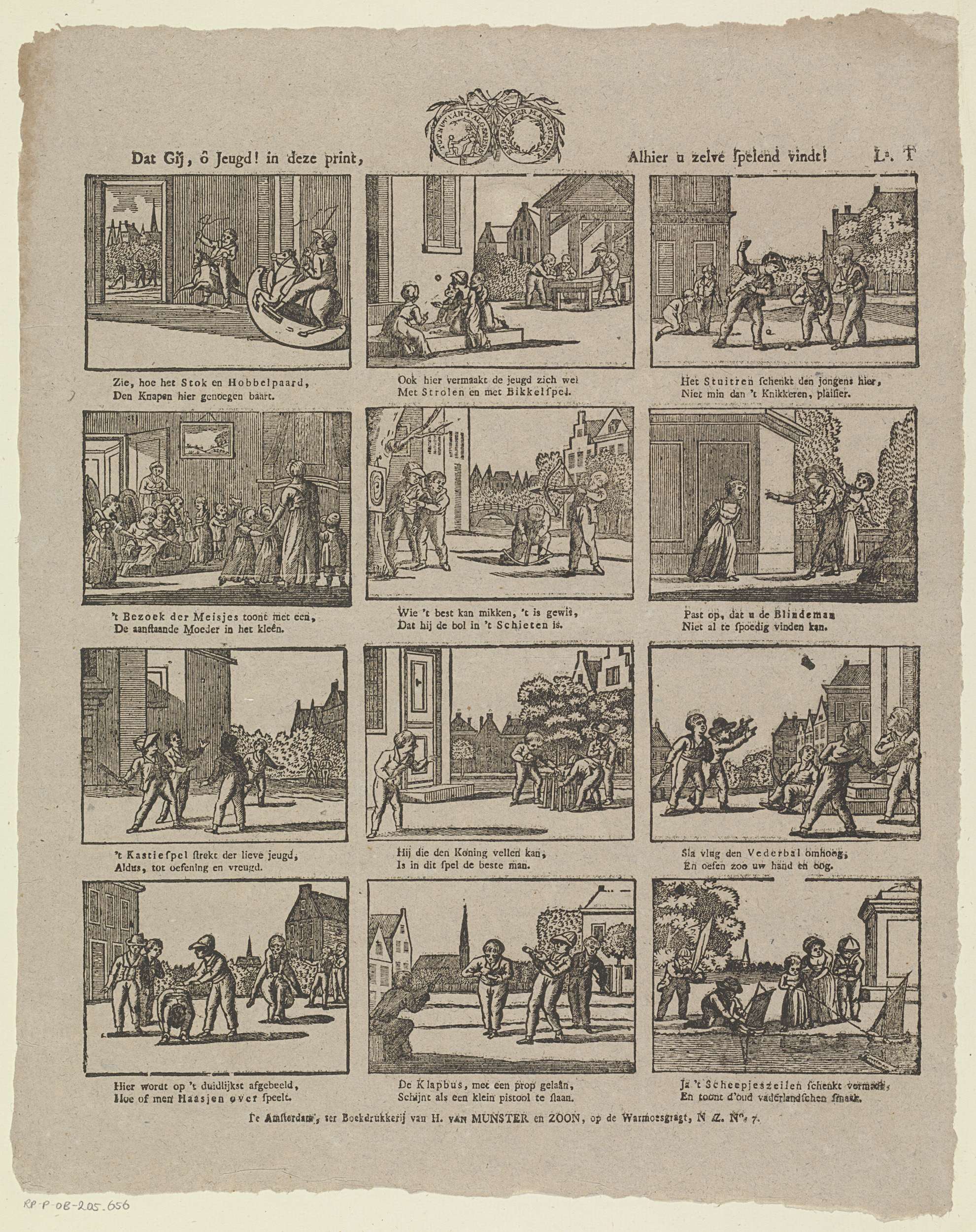 Blad met 12 voorstellingen van kinderspelen. Midden boven het zegel van de Maatschappij tot Nut van 't Algemeen. Onder elke afbeelding een tweeregelig vers. Genummerd rechtsboven: L.T.