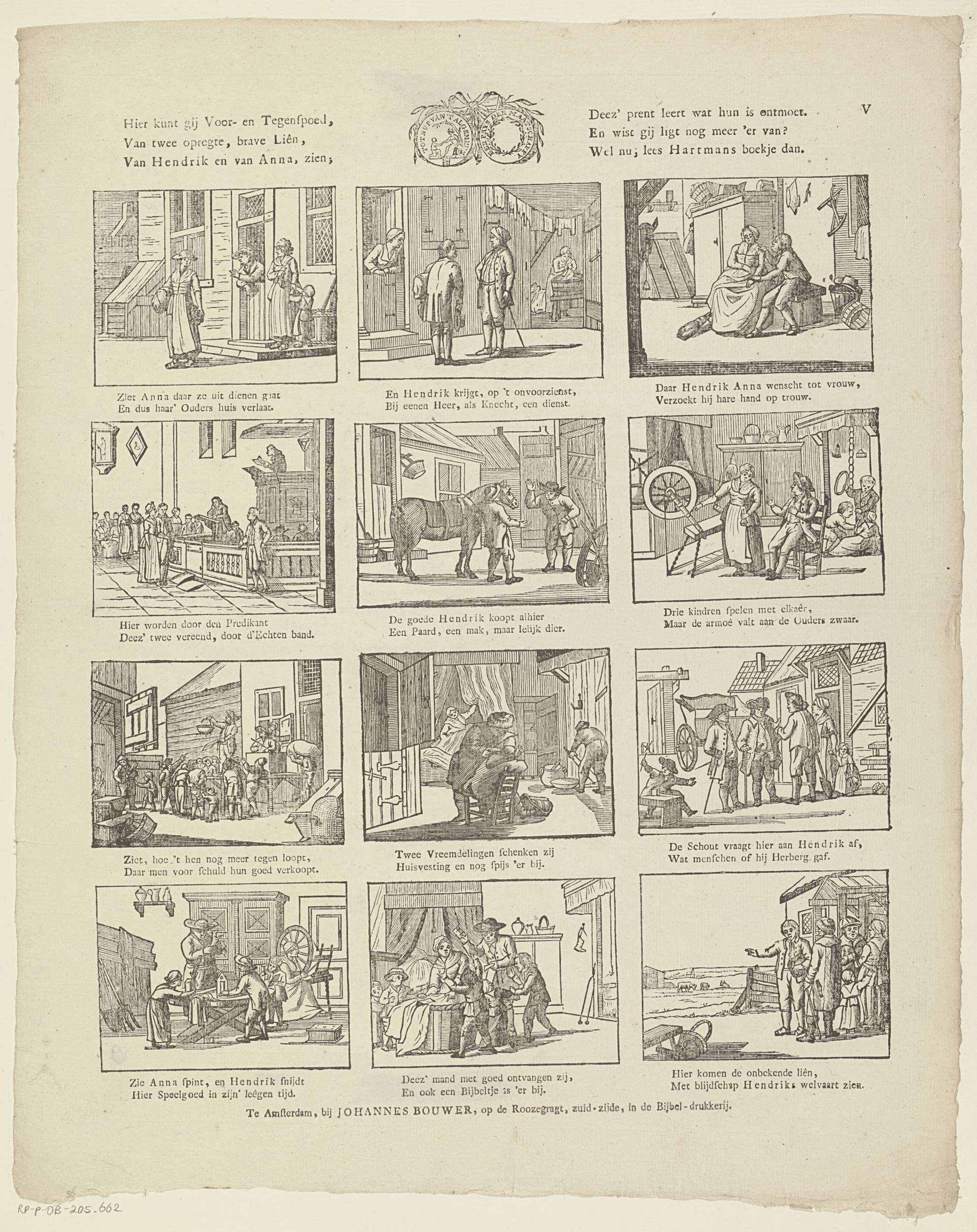 Blad met 12 voorstellingen van voorspoed en tegenspoed in het leven van Hendrik en Anna. Midden boven het zegel van de Maatschappij tot Nut van 't Algemeen. Onder elke afbeelding een tweeregelig vers. Genummerd rechtsboven: V.