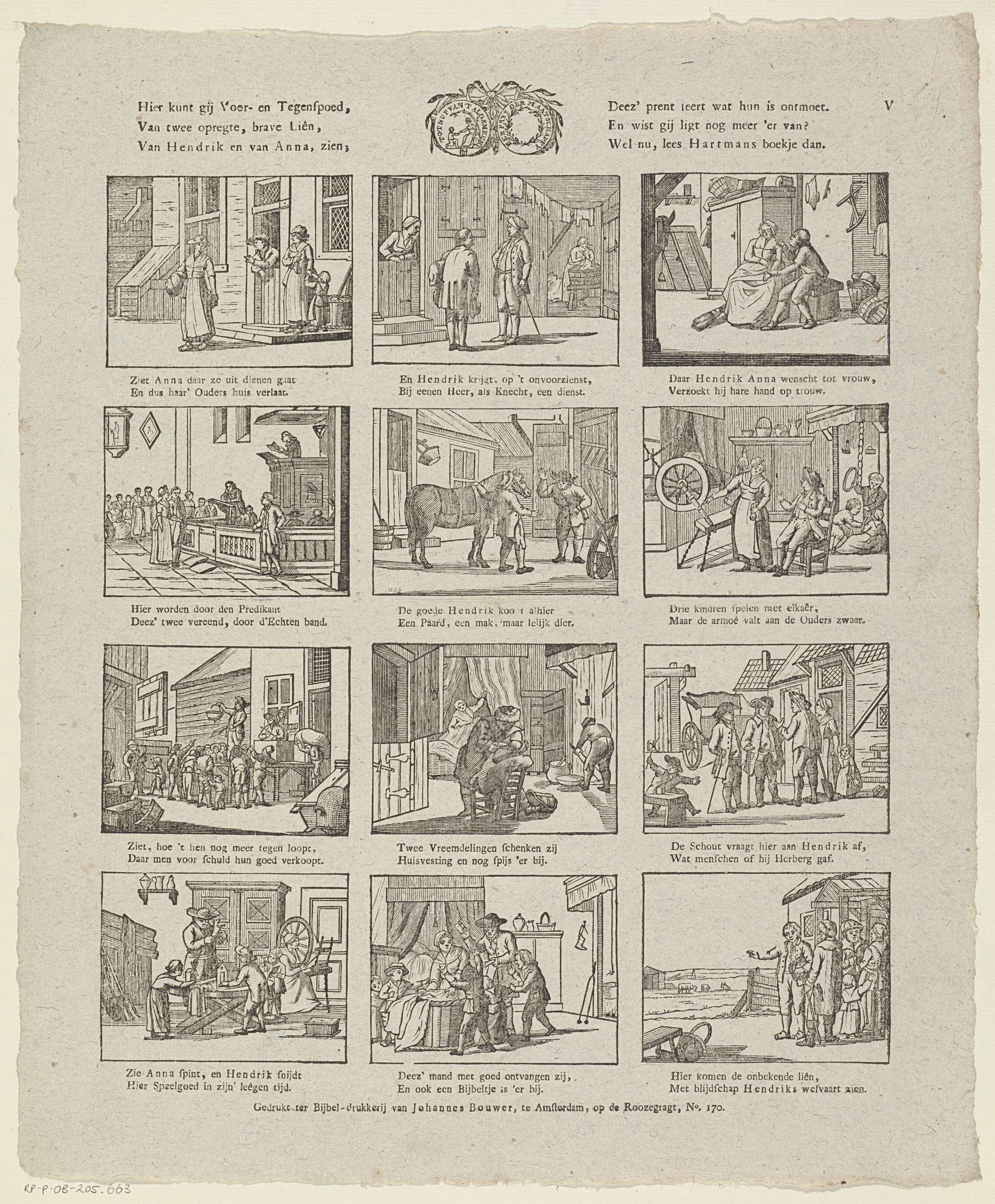 Blad met 12 voorstellingen van voorspoed en tegenspoed in het leven van Hendrik en Anna. Midden boven het zegel van de Maatschappij tot Nut van 't Algemeen. Onder elke afbeelding een tweeregelig vers. Genummerd rechtsboven: V.