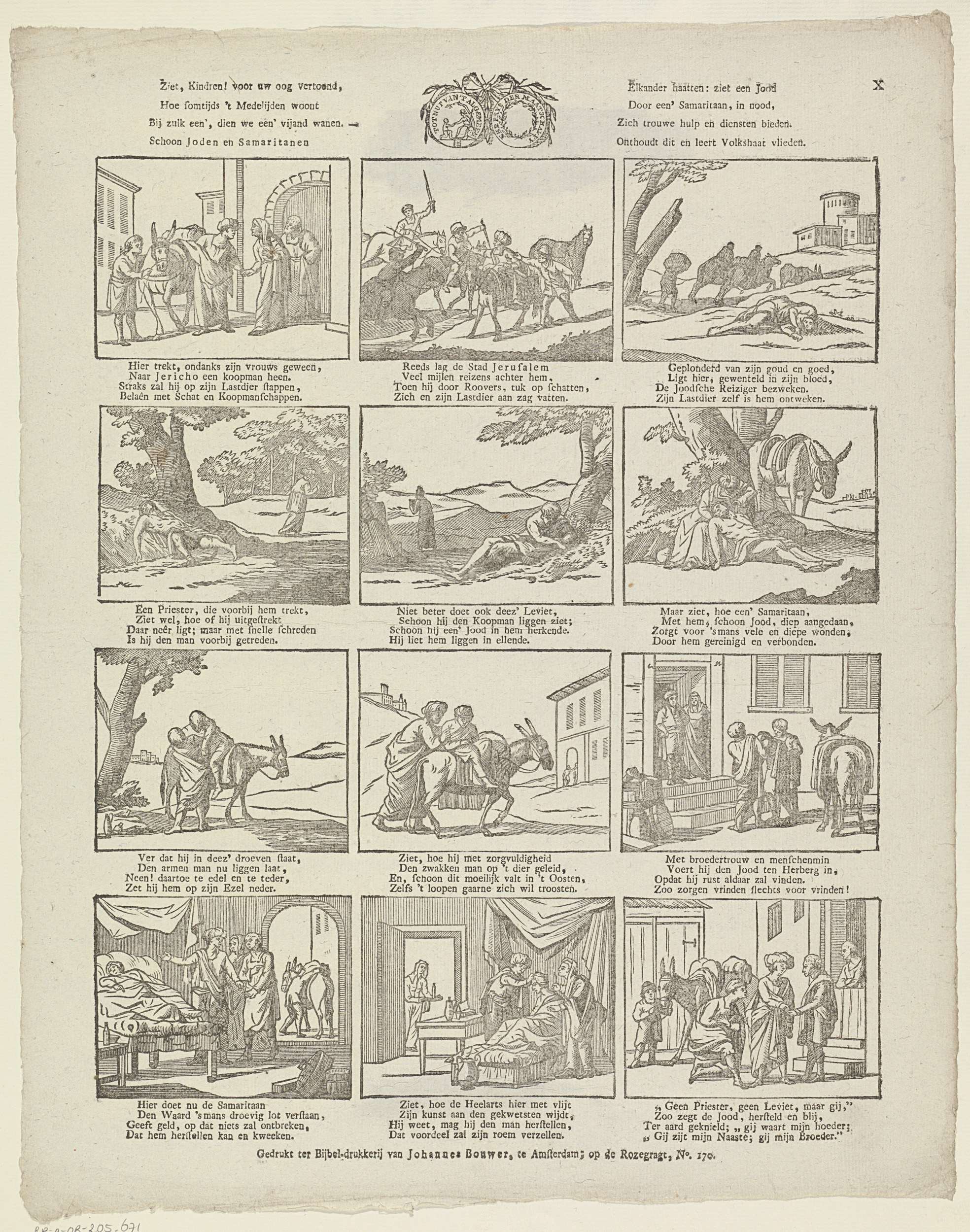Blad met 12 voorstellingen van het verhaal van de Barmhartige Samaritaan. Midden boven het zegel van de Maatschappij tot Nut van 't Algemeen. Onder elke afbeelding een vierregelig vers. Genummerd rechtsboven: X.