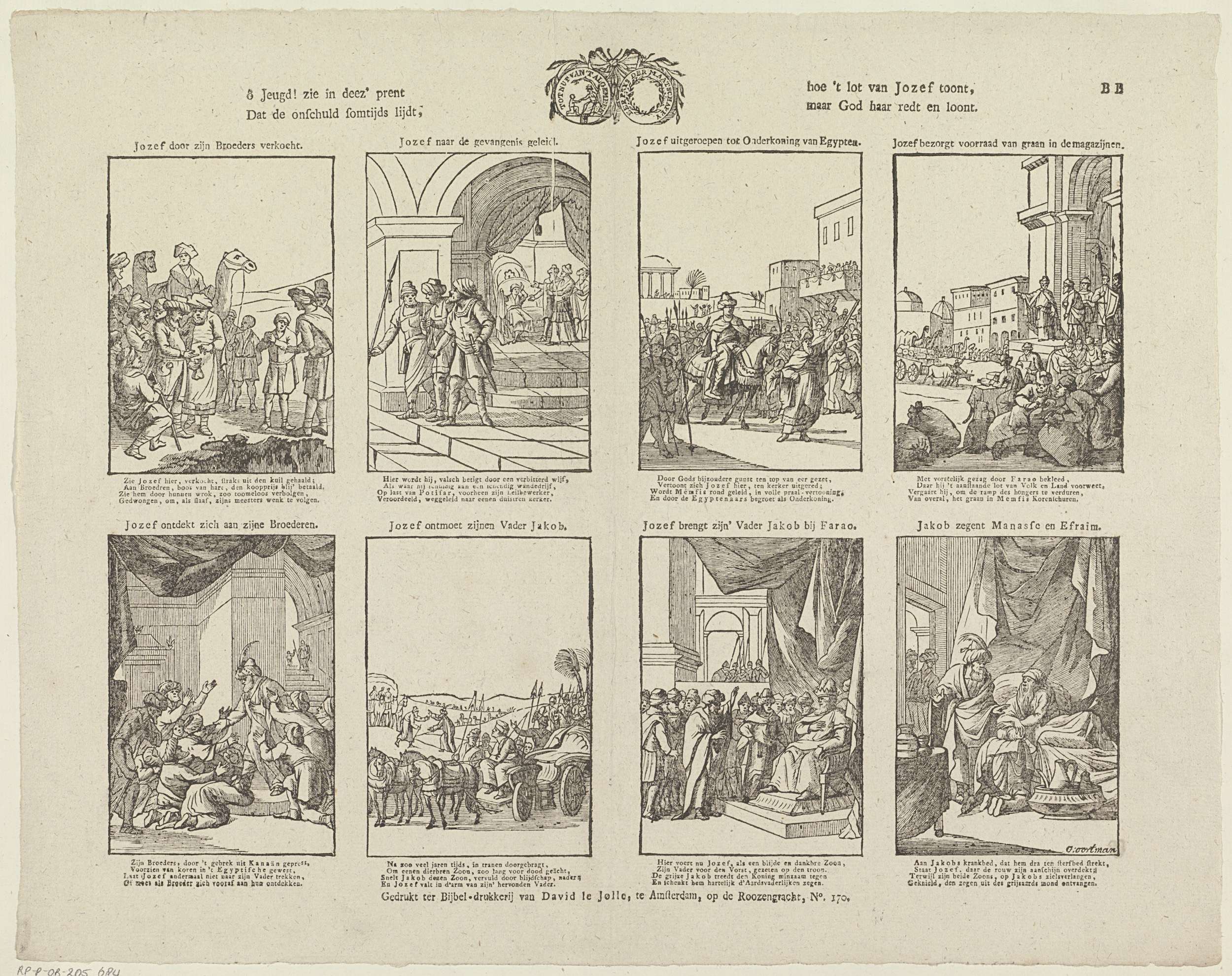 Blad met 8 voorstellingen van het verhaal van Jozef. Midden boven het zegel van de Maatschappij tot Nut van 't Algemeen. Oven elke afbeelding een titel, onder elke afbeelding een vierregelig vers. Genummerd rechtsboven: BB.