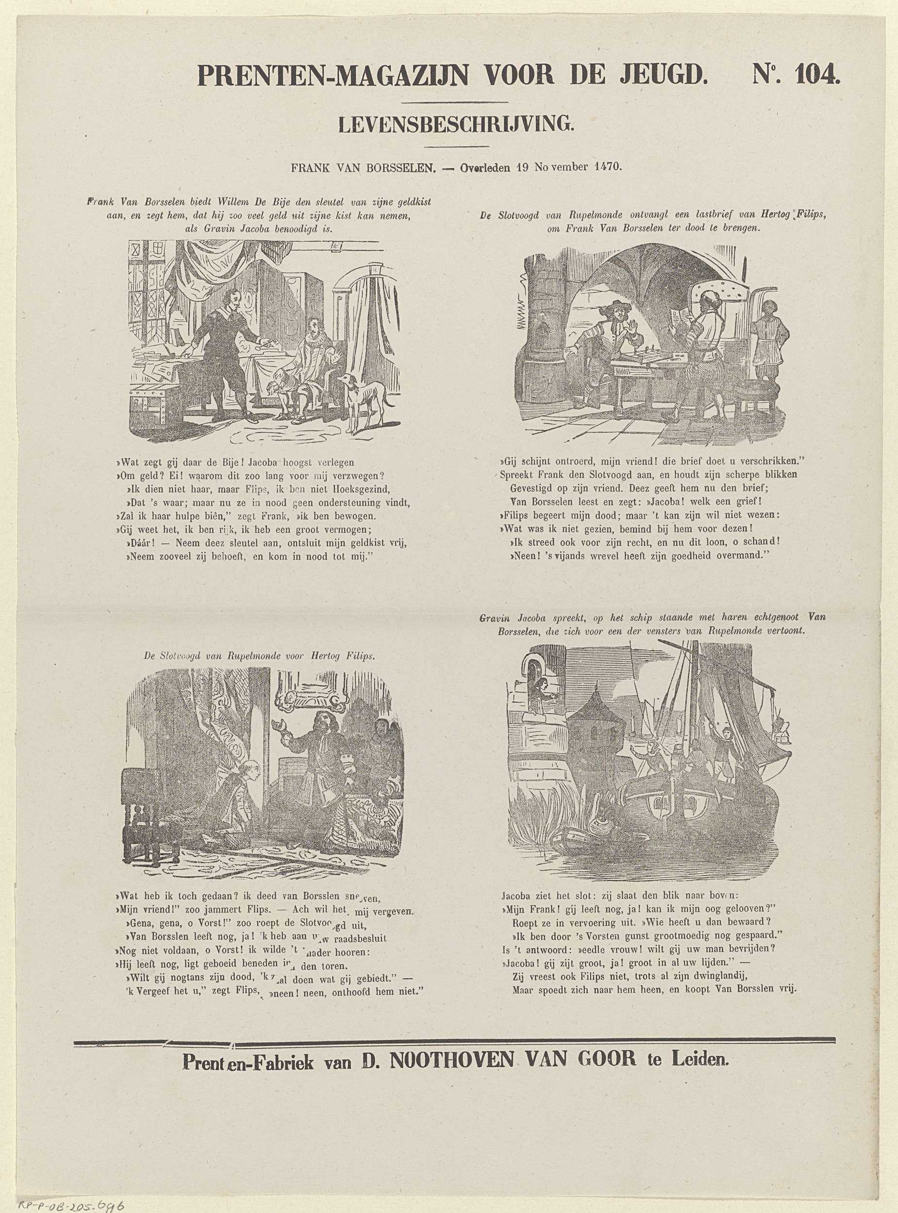 Blad met 4 voorstellingen uit het leven van Frank van Borsselen. Boven elke voorstelling een titel en onder elke voorstelling een achtregelig vers. Genummerd rechtsboven: No. 104.