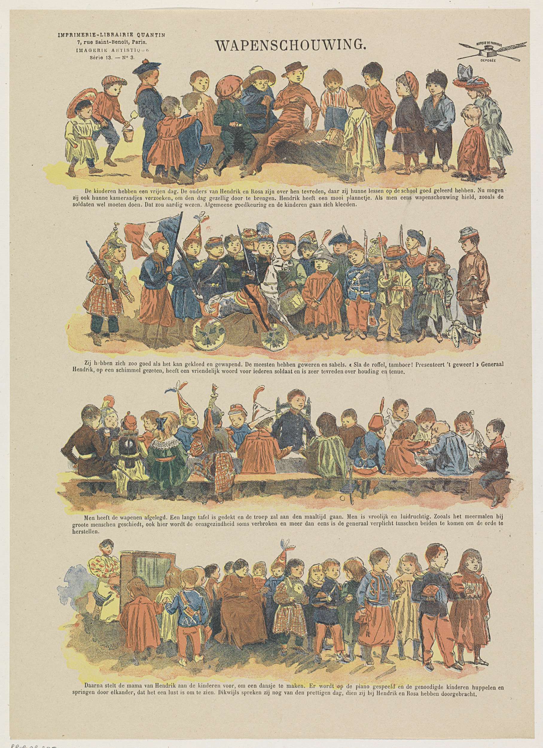 Blad met 4 voorstellingen van kinderen die op een vrije dag samen soldaatje spelen. Onder elke afbeelding een onderschrift. Genummerd linksboven: Série 13. - No. 3.