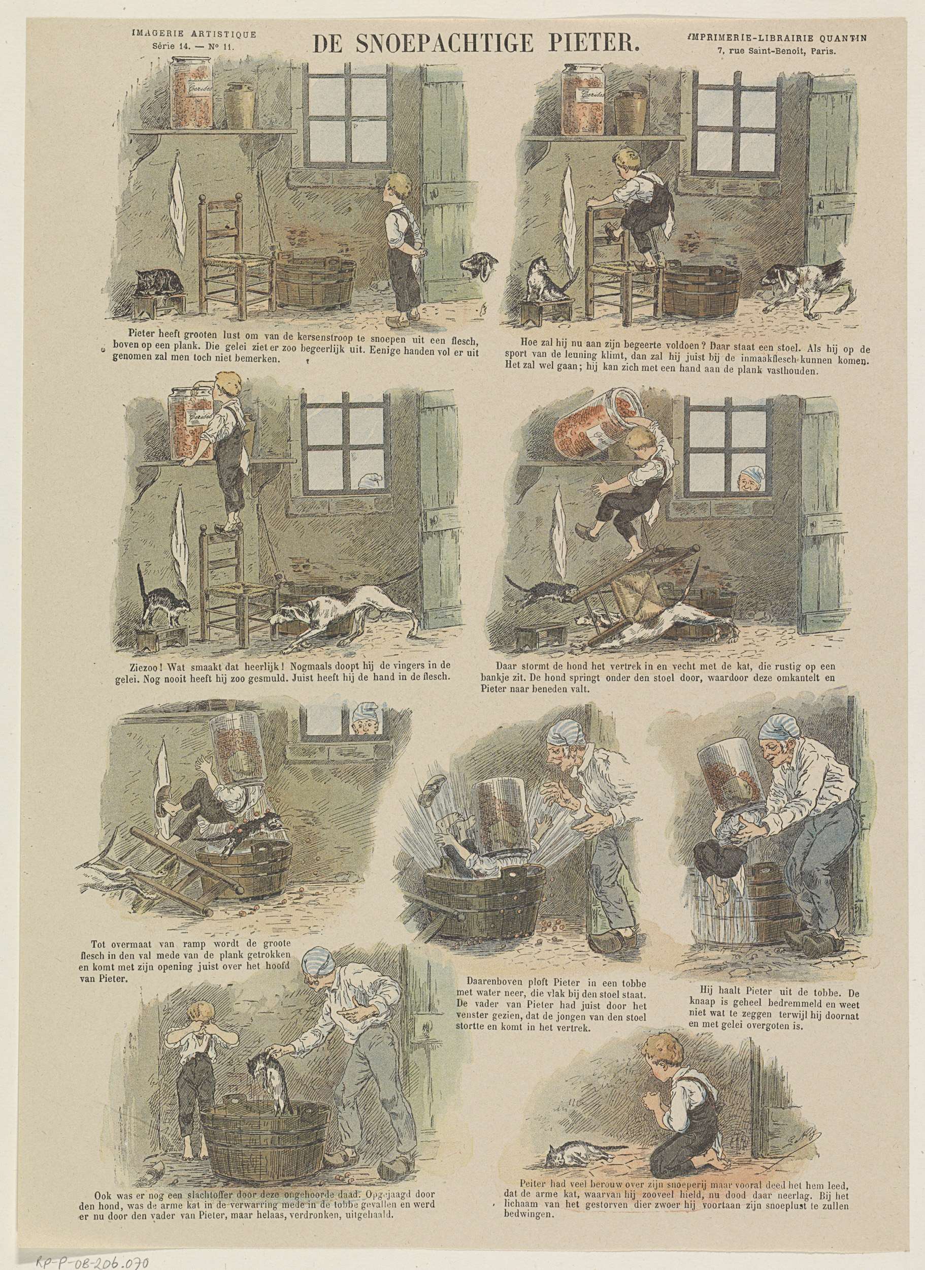 Blad met 9 voorstellingen van Pieter die op een stoel klimt op snoepjes te stelen. Hij valt van de stoel op de kat. De kat is dood. Onder elke afbeelding een onderschrift. Genummerd linksboven: Série 14. - No. 11.