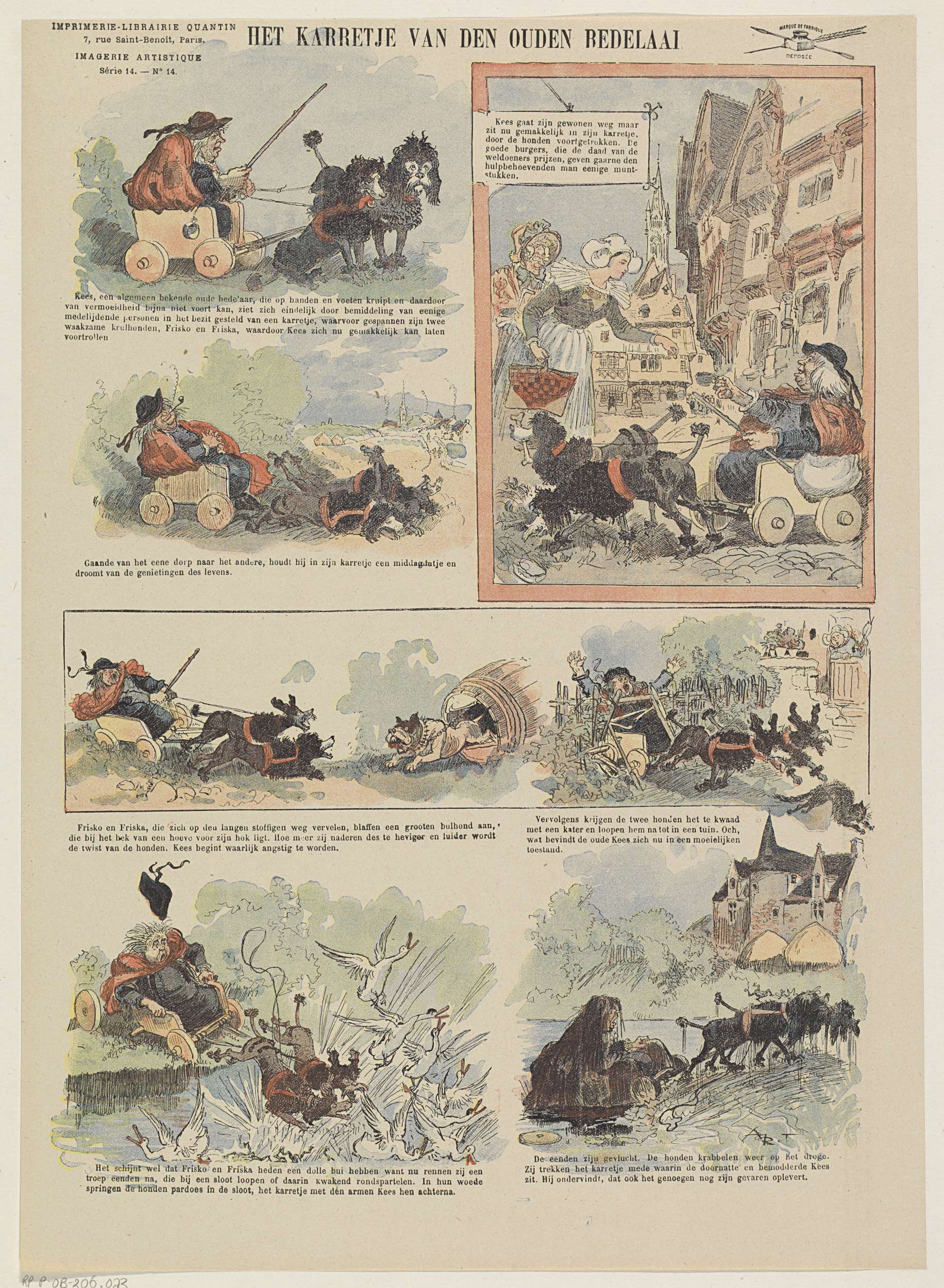 Blad met 7 voorstellingen van een bedelaar in een hondekar. De honden rennen achter een kat aan en springen in een sloot met eenden. De bedelaar belandt in de sloot. Onder elke afbeelding een onderschrift. Genummerd linksboven: Série 14. - No. 14.