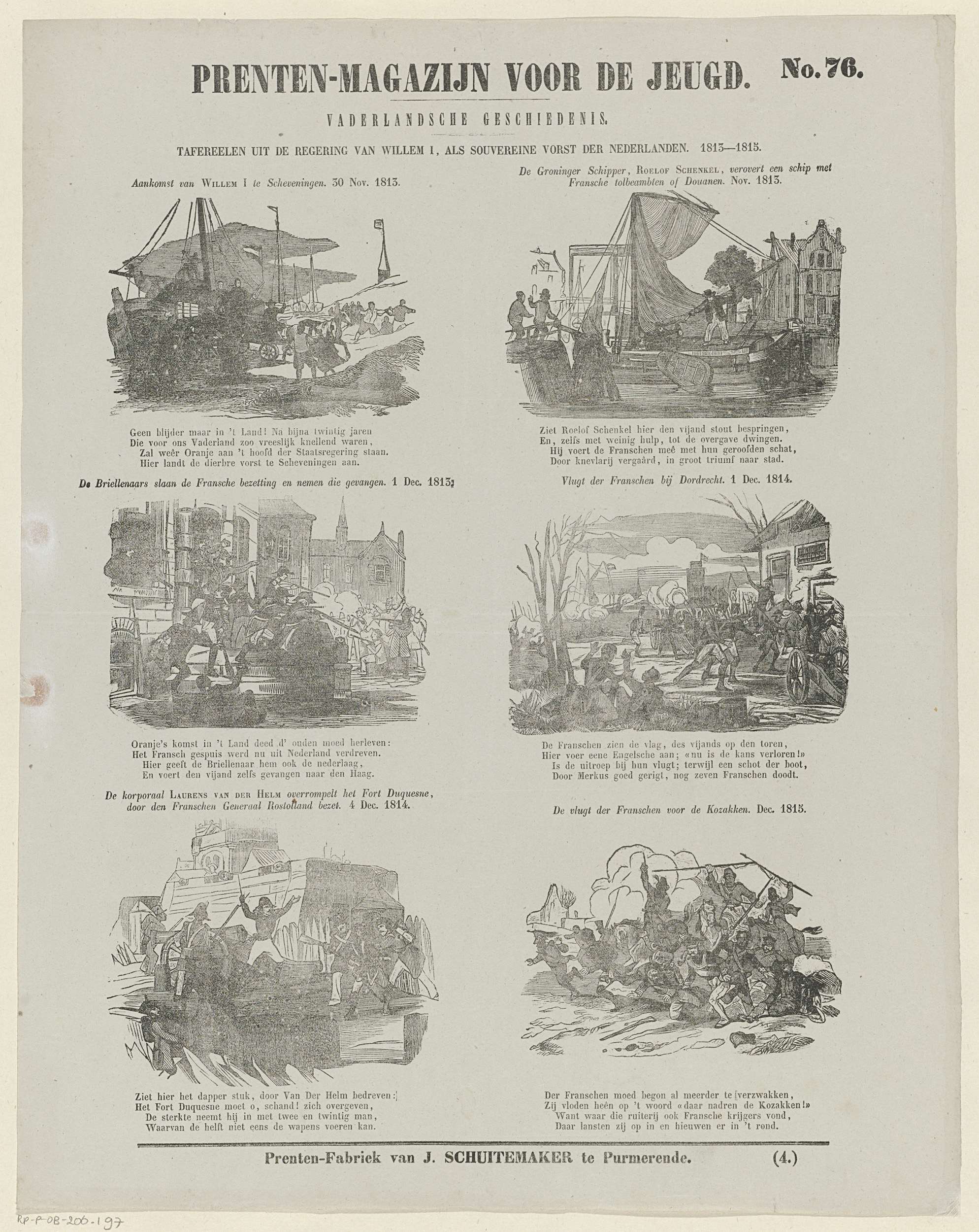 Blad met 6 voorstellingen van gebeurtenissen ten tijde van de regering van Willem I Frederik als Soeverein Vorst der Verenigde Nederlanden (1813-1815). Boven elke voorstelling een titel en onder elke voorstelling een vierregelig vers. Genummerd rechtsboven: No. 76, genummerd rechtsonder: (4.).